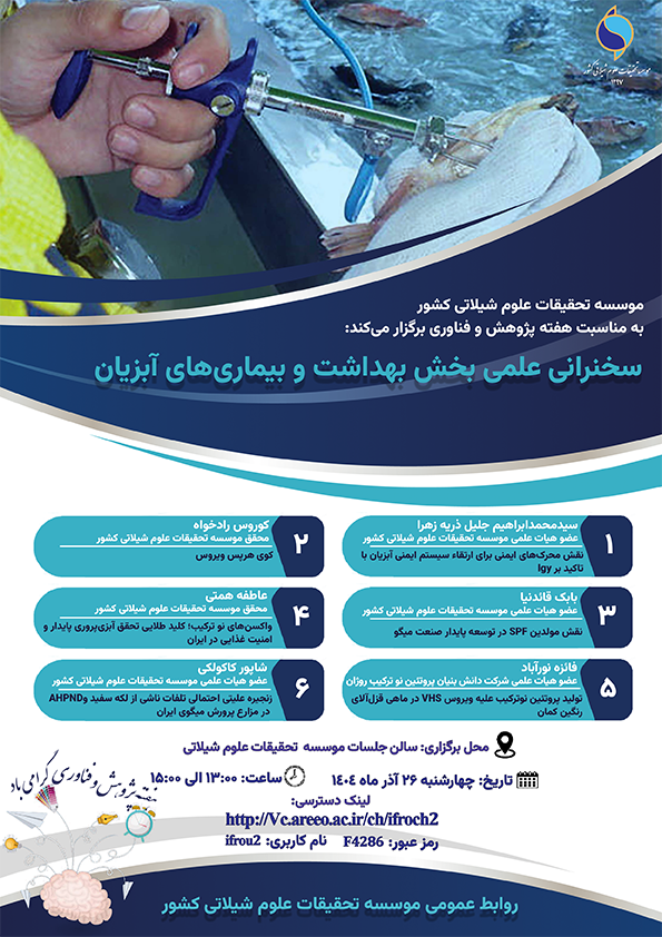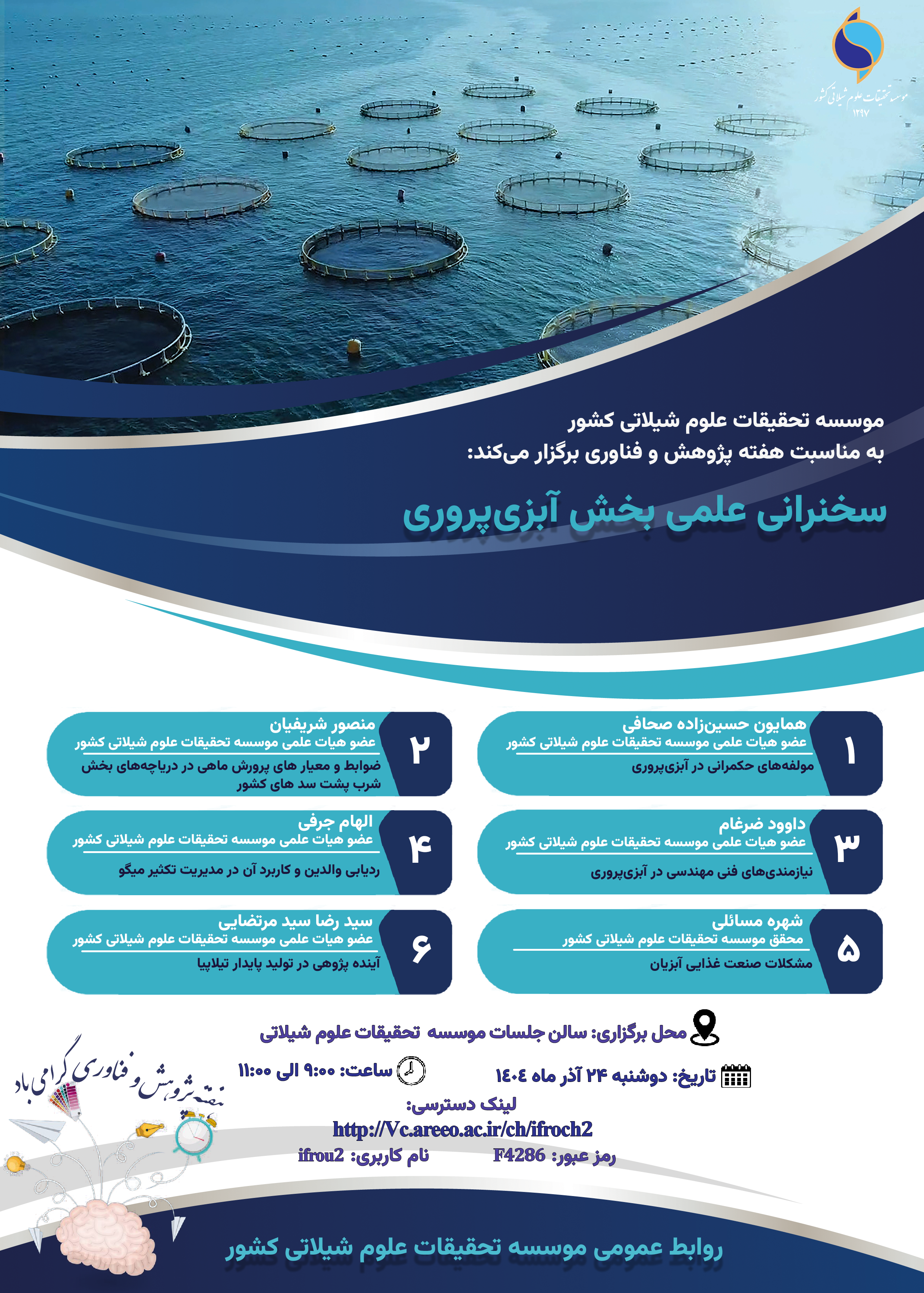 به مناسبت هفته پژوهش و فناوری، مجموعه‌ای از سخنرانی‌های تخصصی با حضور پژوهشگران و اعضای هیئت علمی در پژوهشکده آبزی‌پروری آب‌های داخلی بندرانزلی برگزار و یافته‌ها و دستاوردهای جدید در زمینه روتیفر، جیره‌نویسی، پروبیوتیک‌های بومی، مدیریت ذخایر آبزی و سنجش...