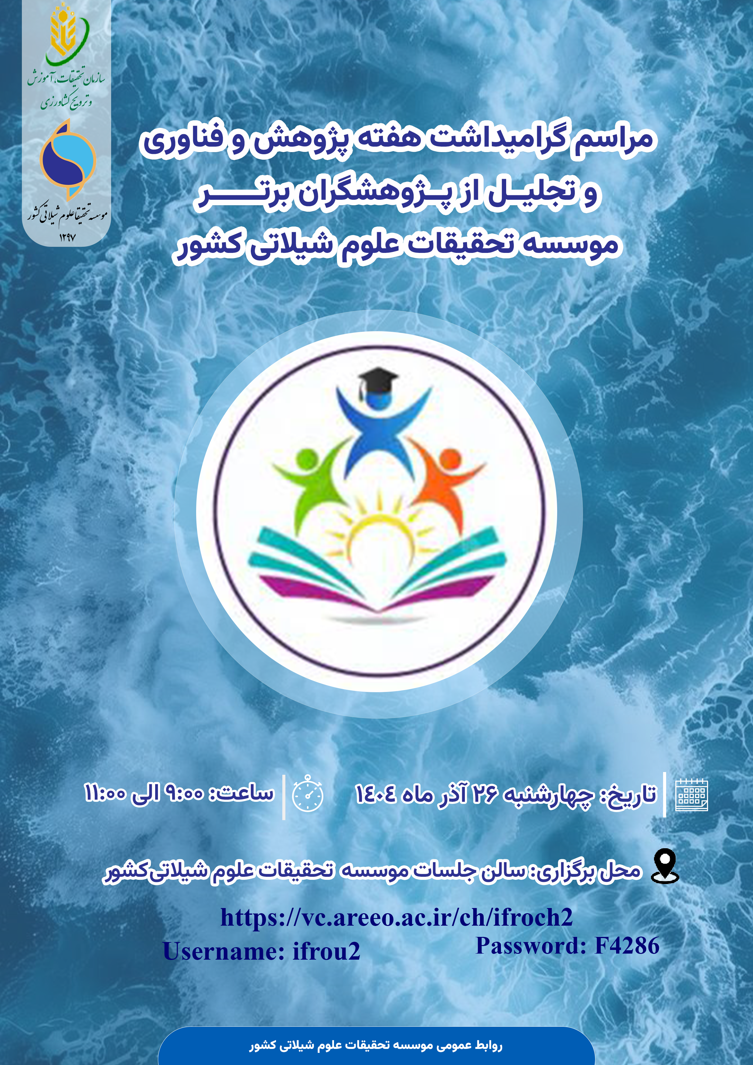 محمدتقی آژیر پژوهشگر مروجان ارشد و محقق معین مرکز تحقیقات ماهیان سردآبی کشور اقدام به برگزاری دوره آموزشی با عنوان "بررسی فیزیولوژی تولیدمثل در ماهی قزل‌‌آلای رنگین‌‌کمان (Oncorhynchus mykiss) با تاکید بر تشخیص جنسیت به روش‌های میکروسکوپی و ماکروسکوپی...