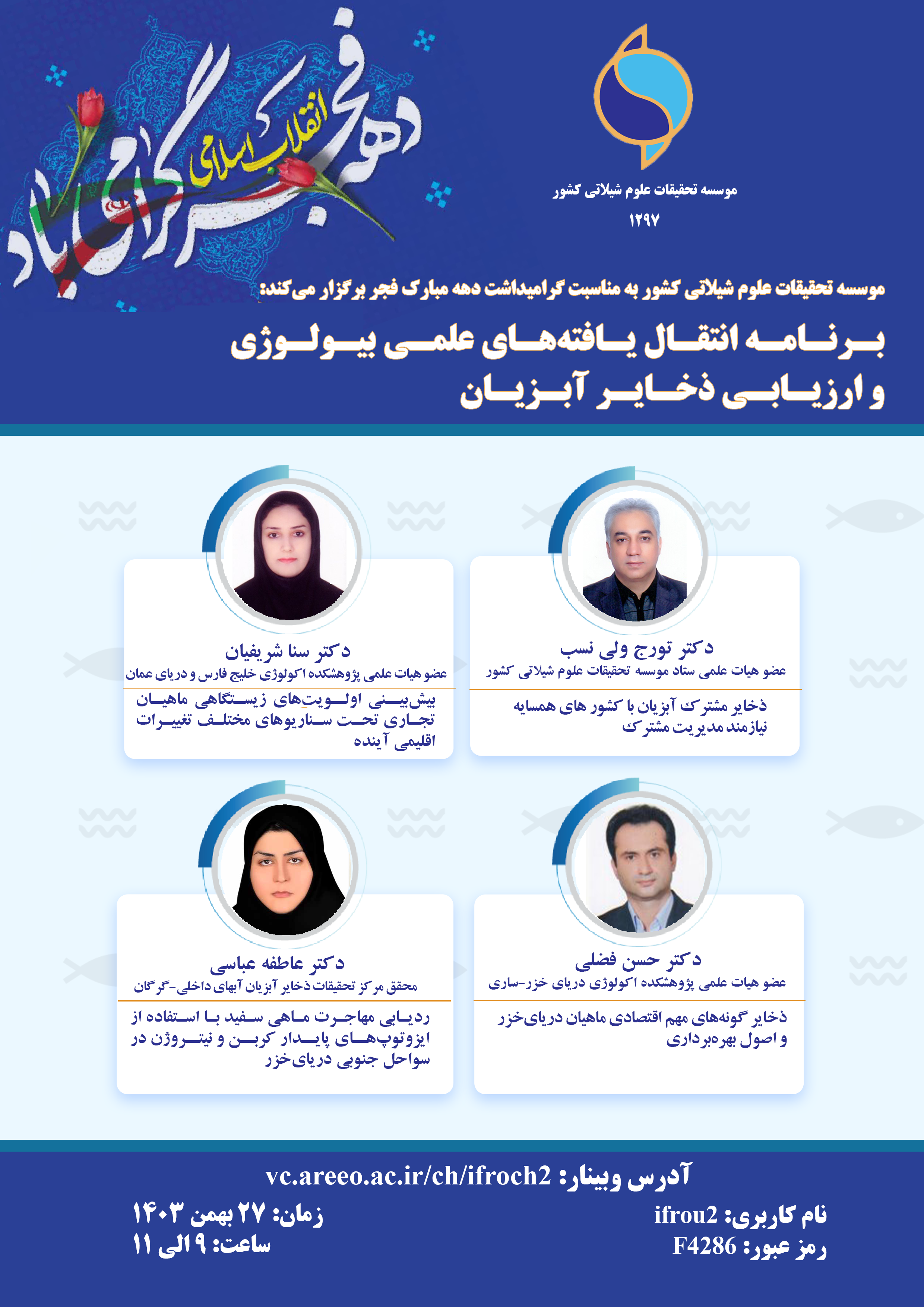 این برنامه علمی با حضور فرهاد کیمرام، آرزو وهابنژاد، مسطوره دوستدار، زهره مخیر از بخش بیولوژی و ارزیابی ذخایر ستاد موسسه و فرحناز لکزایی، مدیر گروه ترویج و انتقال یافتههای تحقیقاتی، بهصورت حضوری و آنلاین برگزار شد. در مجموع، ۵۰ نفر از محققین، بهرهبرداران و متخصصین حوزه شیلات در این برنامه شرکت داشتند.