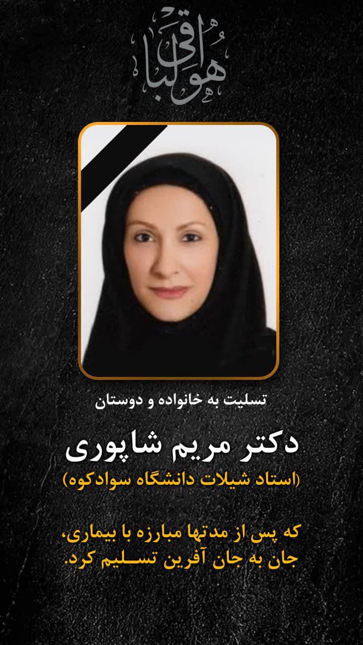 با نهایت تأسف و تأثر، درگذشت سرکار خانم دکتر مریم شاپوری، استاد گرانقدر و فرهیخته گروه شیلات دانشگاه سوادکوه را به جامعه علمی و دانشگاهی کشور، همکاران ارجمند، خانواده محترم آن مرحومه و دانشجویان ایشان تسلیت عرض مینماییم.