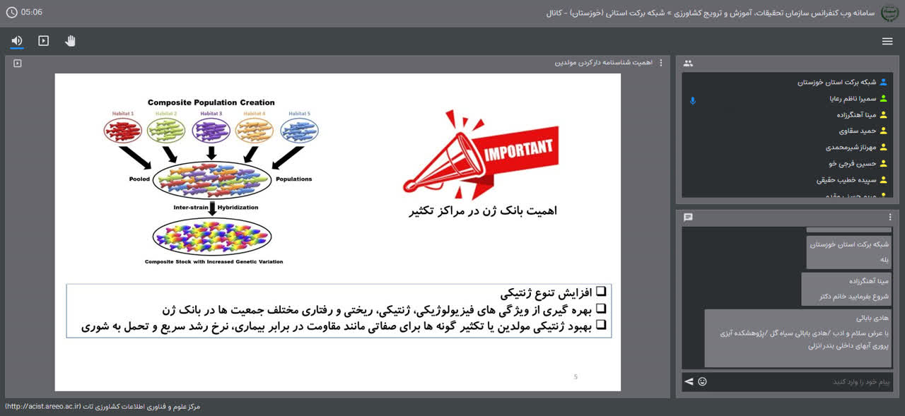 در ادامه این وبینار، وی به تشریح شناسنامه جمعیتهای نخستین بانک ژن زنده کپور معمولی در پژوهشکده آبزیپروری آبهای جنوب کشور پرداخت و کاربرد این شناسنامه را در تداوم برنامه اصلاح نژاد ماهی کپور معمولی در پژوهشکده تبیین کرد.