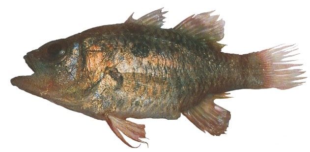 بدن دوكي شكل و فشرده. سر بزرگ؛ داراي دو باله پشتي، اولين باله پشتي با 7 خار و دومين باله پشتي داراي 1 خار و 9 شعاع نرم. باله مخرجي داراي 2 خار و 8 شعاع نرم. باله سينهاي داراي 13 شعاع نرم. تعداد فلسها در طول خط جانبي 25 عدد.