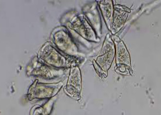 "زئوتامنیوم Zoothamnium sp." درسطح بدن خرچنگ دراز آبشیرین Astacus leptodactylus دیده شده است، مژه دارانی غیر متحرک و فاقد اندام حرکتی هستند که قبلا در خانواده "ورتیسلیده Vorticellidae " طبقه بندی می شدند، ولی اخیرا در خانواده زئوتامنیده Zoothamniidae" قرار گرفته اند، این مژه داران کلنی های منشعب بر روی سطح بدن موجودات آبزی ایجاد میکند، اندازه کلنی ها بسته به نوع گونه می تواند از چندین "زوئید Zooids" (یک منفرد که بخش ی از یک کلنی است) تا صدها "زوئید" متغیر باشد، جنس "زئوتامنیوم / Zoothamnium" بیش از هفتاد گونه را شامل می شود ولی تمایز بین گونه ها به دلیل شباهت هایی در شکل و عملکرد اغلب دشوار است، شکل بدن در کلنی ها مخروطی تا تقریباً کروی بوده و با یک ساقه به ساقه اصلی در قسمت خلفی متصل می شوند.