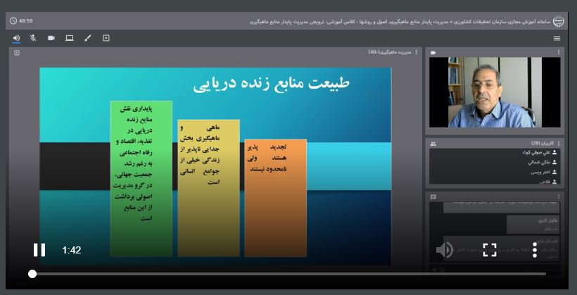 دوره آموزشی- ترویجی با عنوان " مدیریت پایدار منابع ماهیگیری، اصول و روش ها " در روز دوشنبه دوم تیرماه 1398 با حضور بیش از 70 نفر از همکاران موسسه، پژوهشکده ها و مراکز تحقیقاتی، همکاران سازمان شیلات تهران و مراکز، و تعدادی از همکاران مراکز جهاد استان، توسط دکتر سیدامین الله تقوی مطلق، عضو هیأت علمی موسسه، از طریق سامانه وبینار برگزار گردید.