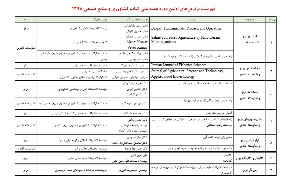 به گزارش روابط عمومی موسسه تحقیقات علوم شیلاتی کشور، مراسم بیست و هفتمین دوره هفته کتاب وزارت جهاد کشاورزی و اولین دوره هفته ملی کتاب کشاورزی و منابع طبیعی در سالن فجر سازمان تحقیقات، آموزش و ترویج کشاورزی برگزار شد. مجله علمی موسسه به سردبیری دکتر نیما پورنگ رتبه برتر را نیز کسب کرد. در این مراسم از کتاب ها، مجلات علمی، آثار ترویجی (نشر ترویجی، و دستنامه و اپلیکیشن) کتابخانه و کتابدار و پورتال برتر در حوزه کشاورزی ومنابع طبیعی نیز تقدیر به عمل آمد.