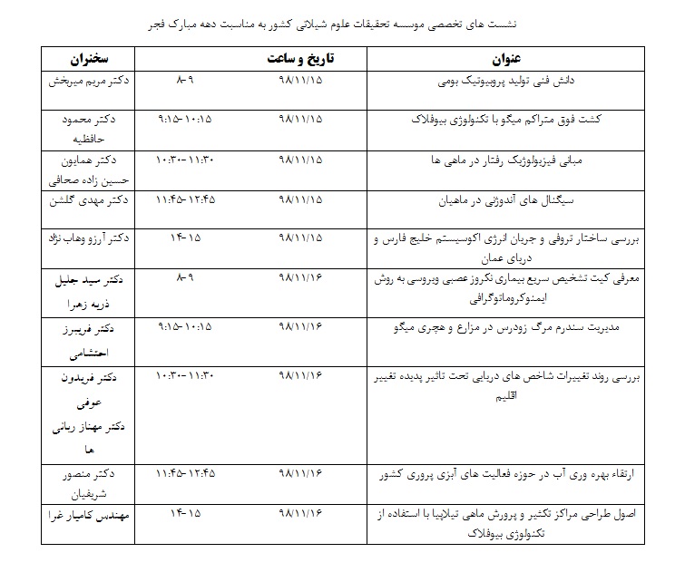یک شنبه سیزدهم بهمن 1398 برگزاری سخنرانی علمی نشست های تخصصی موسسه تحقیقات علوم شیلاتی کشور به مناسبت دهه مبارک فجر