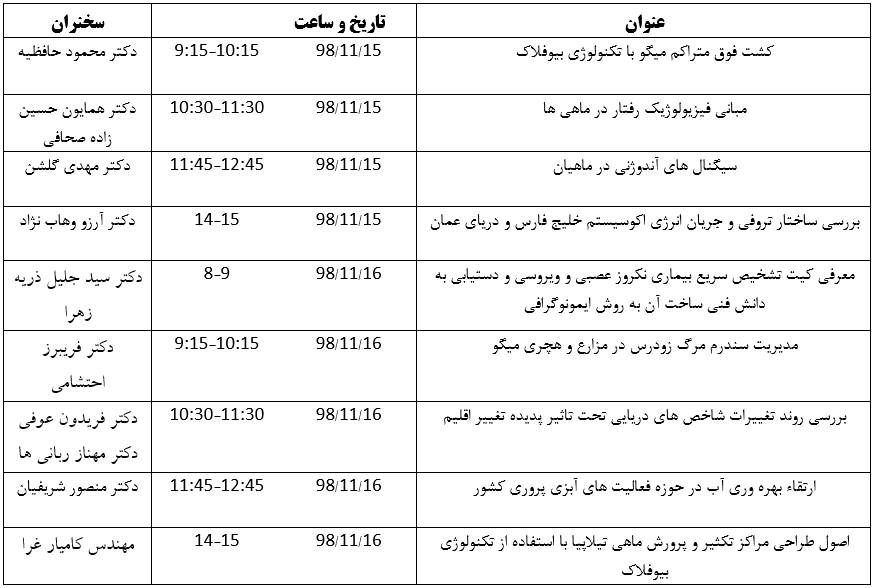 به گزارش روابط عمومی موسسه تحقیقات علوم شیلاتی کشور، همزمان با سالروز پیروزی انقلاب اسلامی و در راستای ارتقای سطح علمی همکاران موسسه، سخنرانی هایی با موضوعات گوناگون تخصصی برگزار خواهد شد. این سخنرانی ها در روزهای سه شنبه و چهارشنبه مورخ ۱۵ و ۱۶ بهمن ماه سال جاری در سالن جلسات موسسه خواهد بود و همکاران علاقه مند میتوانند با توجه به برنامه زمانبندی، در این سخنرانی ها حضور یافته و از آخرین یافتههای علمی بخش تحقیقات شیلات بهرهمند شوند. گفتنی است، کشت فوق متراکم میگو با تکنولوژی بیوفلاک (با سخنرانی دکتر محمود حافظیه)، مبانی فیزیولوژیک رفتار در ماهی ها (با سخنرانی دکتر همایون حسینزاده صحافی)، سیگنالهای آندوژنی در ماهیان (با سخنرانی دکتر مهدی گلشن)، بررسی ساختار تروفی و جریان انرژی اکوسیستم خلیج فارس و دریای عمان (با سخنرانی دکتر آرزو وهاب نژاد)، معرفی کیت تشخیص بیماری نکروز عصبی و ویروسی و دستیابی به دانش فنی ساخت آن به روش ایمنوگرافی (با سخنرانی دکتر سید جلیل ذریه زهرا)، مدیریت سندروم مرگ زودرس در مزارع و هچری میگو (با سخنرانی دکتر فریبرز احتشامی)، بررسی روند تغییرات شاخص های دریایی تحت تاثیر پدیده تغییر اقلیم (با سخنرانی دکتر فریدون عوفی و دکتر مهناز ربانی ها)، ارتقای بهرهوری آب در حوزه فعالیت های آبزی پروری کشور (با سخنرانی دکتر منصور شریفیان) و اصول طراحی مراکز تکثیر و پرورش ماهی تیلاپیا با استفاده از تکنولوژی بیوفلاک (با سخنرانی مهندس کامیار غرا) از جمله موضوعات اصلی سخنرانی ها هستند.