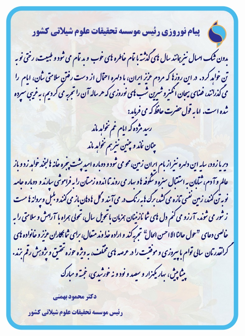 آرزو می کنم دل های شما نازنینان، همزمان با تحویل سال، تحولی همراه با آرامش و سلامتی را به خالصی دعای "حول حالنا الا احسن الحال" تجربه کند و اراده خداوند متعال، برای شما همکاران عزیز و خانواده های گرانقدرتان سالی توام با پیروزی و موفقیت را در عرصه های مختلف، به ویژه حوزه تحقیق و پژوهش رقم بزند.