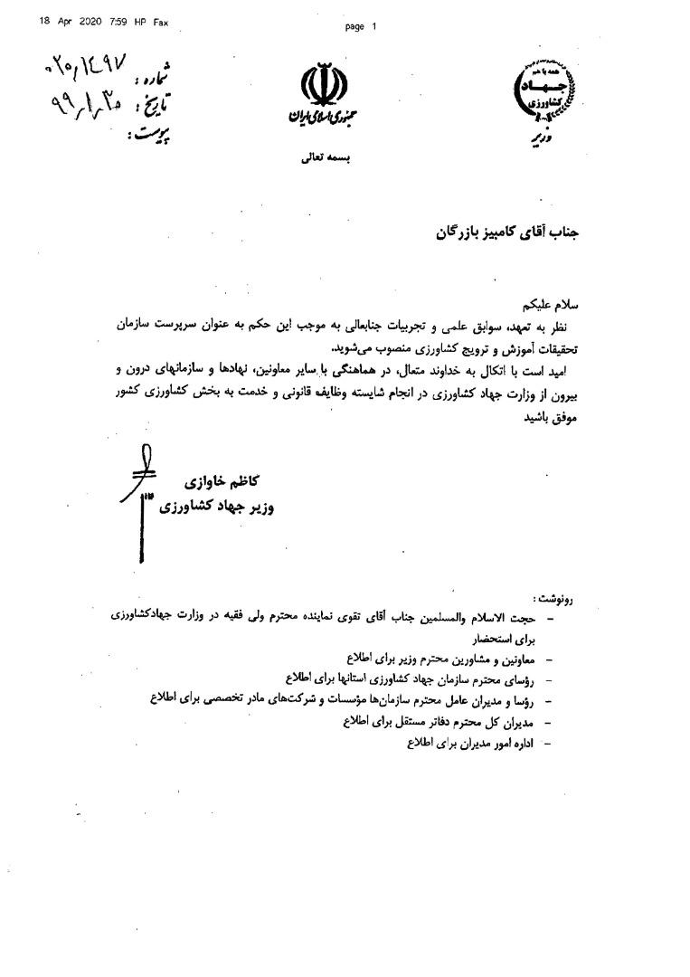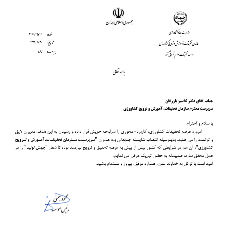 نظر به تعهد سوابق علمی و تجربیات جنابعالی به موجب این حکم به عنوان سرپرست سازمان تحقیقات، آموزش و ترویج کشاورزی منصوب می شوید.