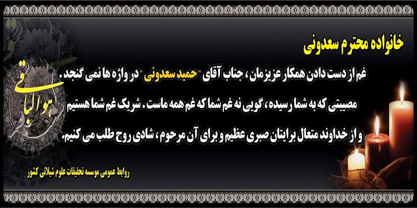 با نهایت تأسف و تأثر درگذشت همکار عزیزمان جناب آقای حمید سعدونی از پرسنل بازنشسته پژوهشکده آبزی پروری جنوب کشور را به کلیه همکاران به ویژه خانواده محترم آن مرحوم تسلیت عرض می نمائیم.