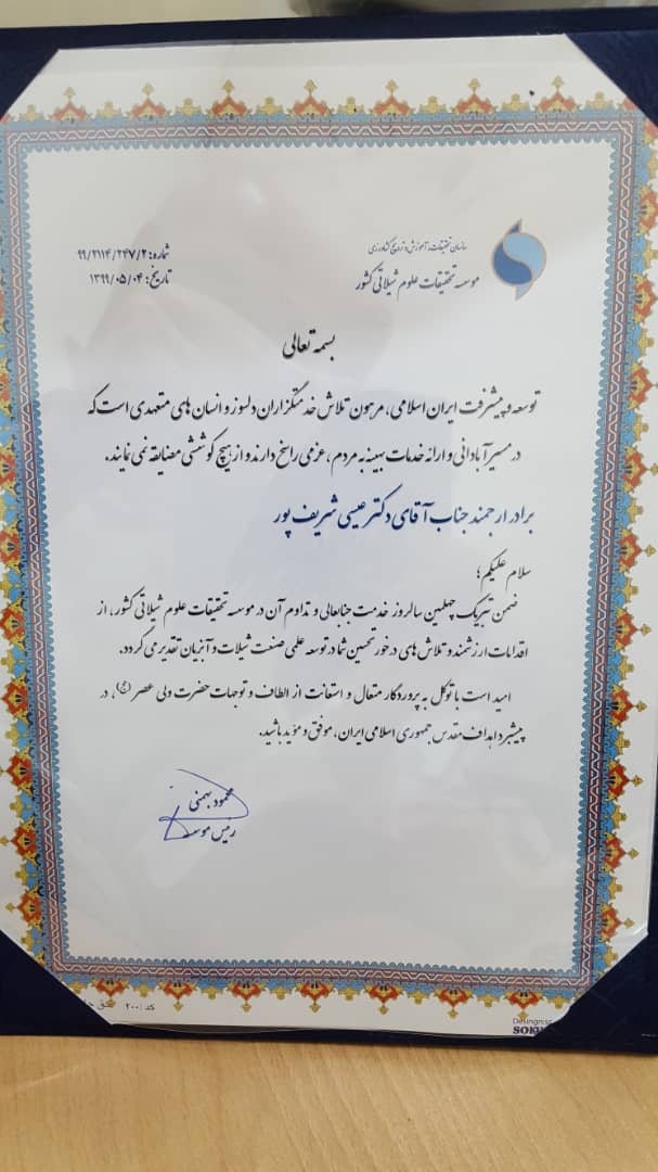 به گزارش روابط عمومی موسسه تحقیقات علوم شیلاتی کشور، دکتر عیسی شریف پور، از معدود محققانی است که توانسته رکورد دار ۴۰ سال خدمت صادقانه در بدنه وزارت جهاد کشاورزی باشد. به همین مناسبت، رییس موسسه تحقیقات علوم شیلاتی کشور، ضمن تقدیر از ایشان، برای تداوم خدمت وی در این موسسه آرزوی توفیق و پیروزی کرد.