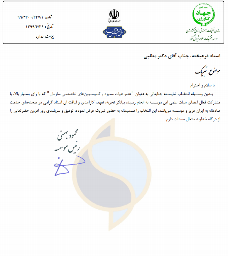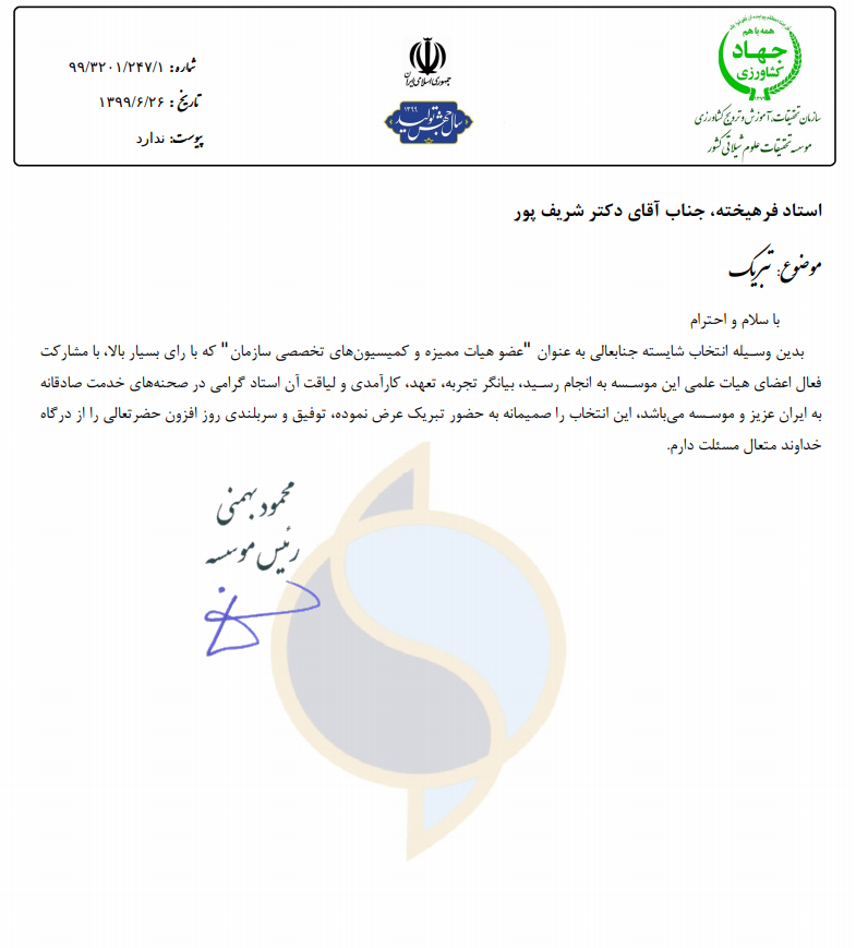 بدین وسیله انتخاب شایسته جنابعالی به عنوان عضو هیات ممیزه و کمیسیون های تخصصی سازمان که با رای بسیار بالا با مشارکت فعال اعضای هیات علمی این موسسه به انجام رسید، بیانگر تجربه، تعهد، کارآمدی و لیاقت آن استاد گرامی درصحنه های خدمت صادقانه به ایران عزیز و موسسه می باشد. این انتخاب را صمیمانه به حضور تبریک عرض نموده، توفیق و سربلندی روز افزون حضرتعالی را از درگاه خداوند متعال، مسئلت دارم.