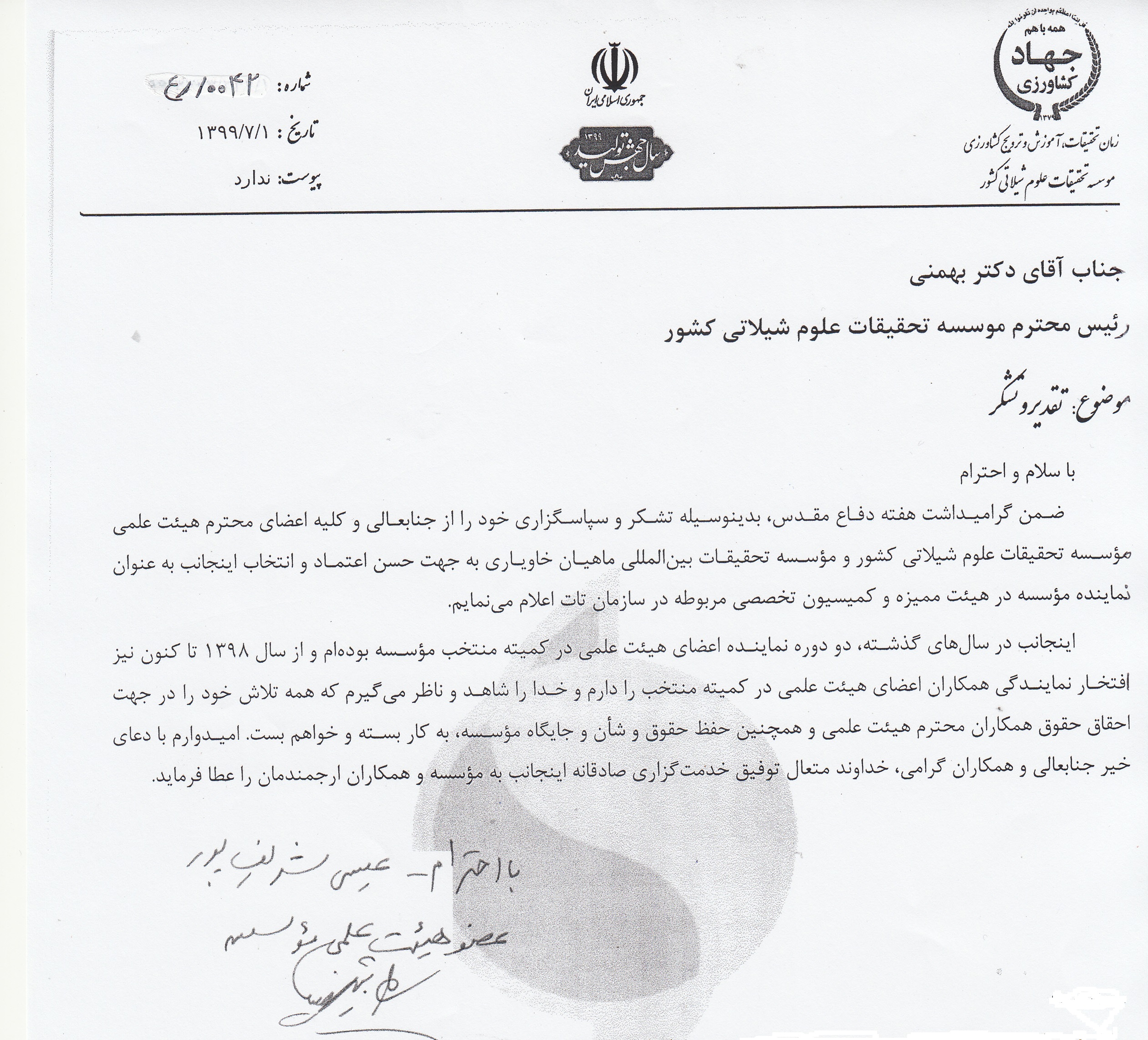 به گزارش روابط عمومی موسسه تحقیقات علوم شیلاتی کشور، در این پیام آمده است: بدینوسیله تشکر و سپاسگزاری خود را از جنابعالی و کلیه اعضای هیئت علمی به جهت حسن اعتماد و انتخاب اینجانب به عنوان نماینده موسسه در هیئت ممیزه و کمیسیون تخصصی مربوطه در سازمان تحقیقات، آموزش و ترویج کشاورزی اعلام می نمایم.