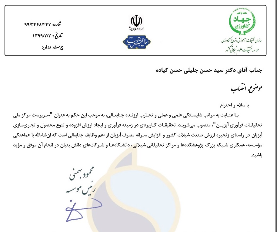 با عنایت به مراتب شایستگی علمی و عملی و تجارب ارزنده جنابعالی به موجب این حکم به عنوان سرپرست مرکز ملی تحقیقات فرآوری آبزیان منصوب می شوید. تحقیقات کاربردی در زمینه فناوری و ایجاد ارزش افزوده و تنوع محصول و تجاریسازی آبزیان در راستای زنجیره ارزش صنعت شیلات کشور و افزایش سرانه مصرف آبزیان از اهم وظایف جنابعالی است که انشاالله با هماهنگی موسسه، همکاری شبکه بزرگ پژوهشکده هاو مراکز تحقیقاتی شیلاتی، دانشگاهها و شرکتهای دانش بنیان در انجام آن موفق و موید باشید
