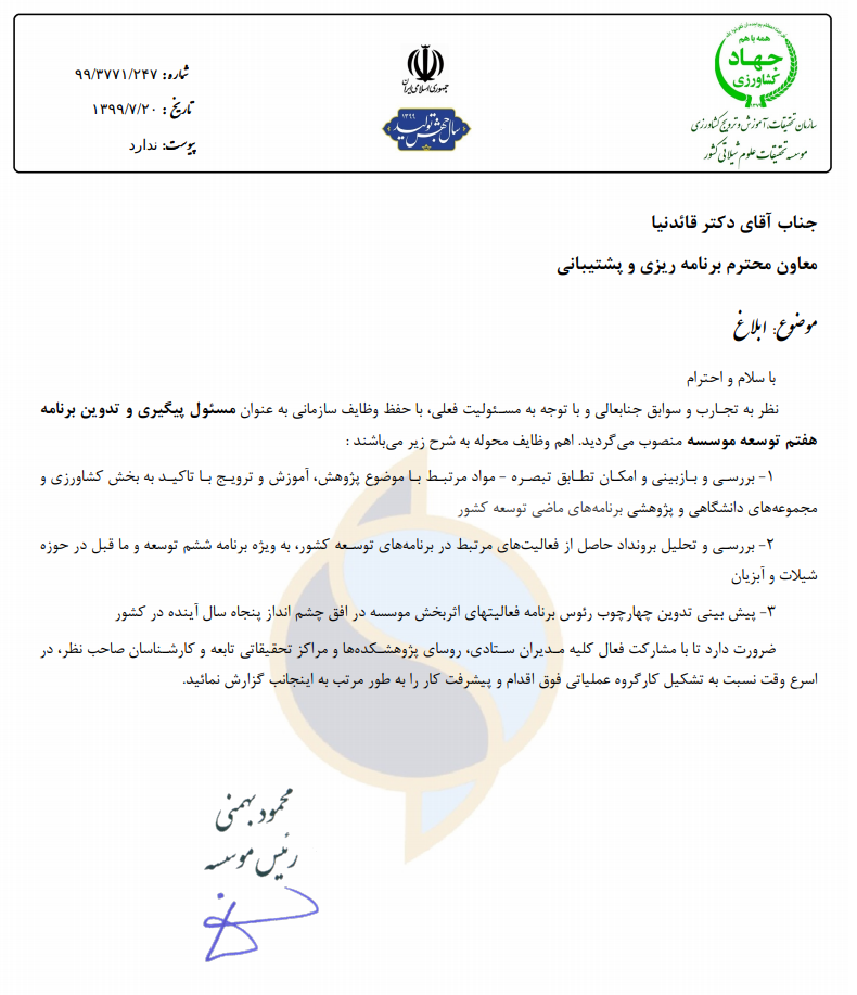 به گزارش روابط عمومی موسسه تحقیقات علوم شیلاتی کشور، در این حکم آمده است: نظر به تجارب و سوابق جنابعالی و با توجه به مسئولیت فعلی با حفظ وظایف سازمانی، به عنوان مسئول پیگیری و تدوین برنامه هفتم توسعه موسسه منصوب می گردید. اهم وظایف محوله به شرح زیر می باشند: