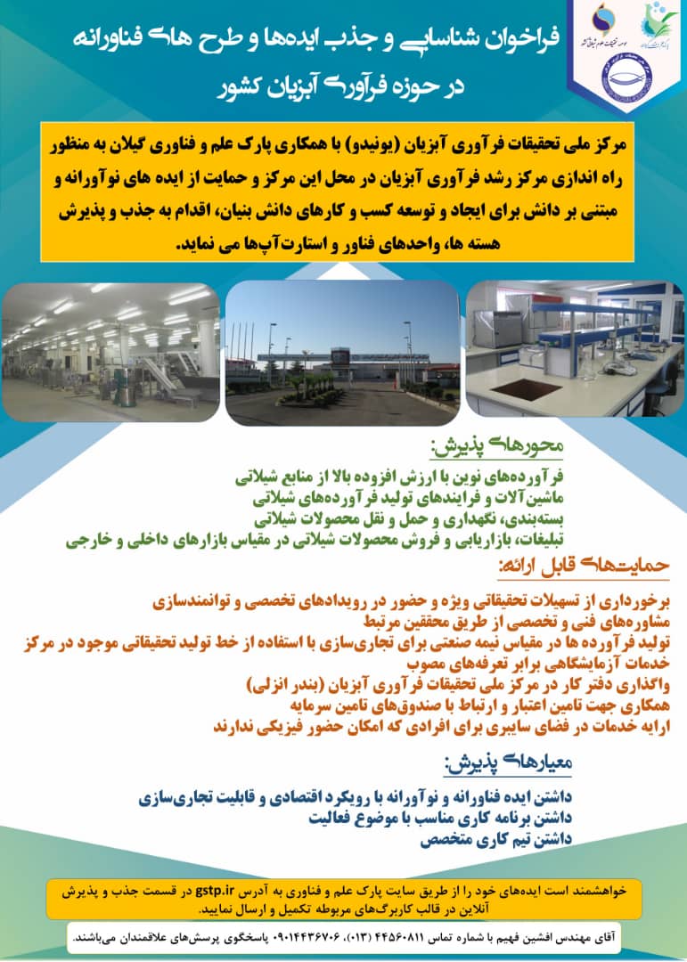 جمعه سی ام آبان 1399 آغاز فعالیت مرکز رشد فرآوری آبزیان در محل مرکز ملی تحقیقات فرآوری آبزیان فعالیت مرکز رشد فرآوری آبزیان در محل مرکز ملی تحقیقات فرآوری آبزیان آغاز شد.