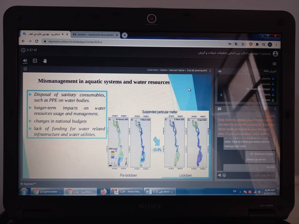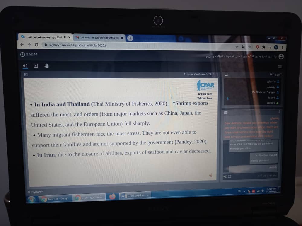 به گزارش روابط عمومی موسسه تحقیقات علوم شیلاتی کشور، پنل تخصصی اول، از ساعت 9 صبح الی 12 با موضوع تاثیر کووید 19 بر آبزی پروری و شیلات با مدیریت دکتر سید جلیل ذریه زهرا و دکتر مهدی گلشن (از محققین و اعضای هیات علمی موسسه تحقیقات علوم شیلاتی کشور) برگزار شد و 12 سخنران با موضوعاتی از قبیل تاثیر کووید 19 در صنعت میگوی بوشهر، خواص ضد ویروسی آبزیان در برابر کووید 19، تاثیرات بیماری همه گیر کووید 19 بر غذاها و فرآورده های دریایی و... به ارائه آخرین یافته های تحقیقاتی خود پرداختند.