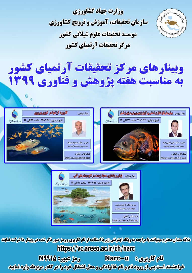 به گزارش روابط عمومی موسسه تحقیقات علوم شیلاتی کشور، مرکز تحقیقات آرتمیای کشور- ارومیه در نظر دارد به مناسبت گرامیداشت هفته پژوهش و نیز ارتقای هرچه بیشتر سطح علمی همکاران تحقیقاتی، 3 وبینار ترویجی در زمینه های مختلف برگزار کند.