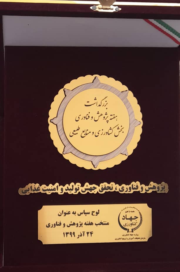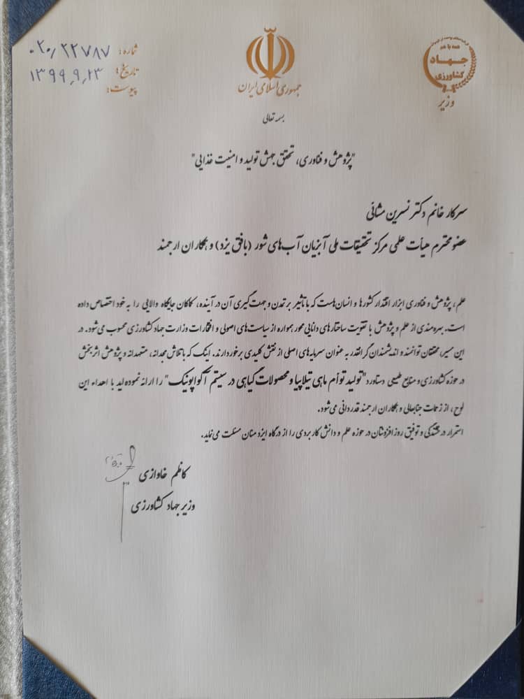 به گزارش روابط عمومی موسسه تحقیقات علوم شیلاتی کشور، مهندس نسرین مشایی، محقق و عضو هیات علمی مرکز تحقیقات ملی آبزیان آبهای شور بافق یزد، با ارائه دستاورد اثر بخش تولید توام ماهی تیلاپیا و محصولات گیاهی در سیستم آکواپونیک، به عنوان پژوهشگر برتر از نظر داوران سازمان تحقیقات، آموزش و ترویج کشاورزی انتخاب و از وزیر جهاد کشاورزی، لوح تقدیر دریافت کرد.