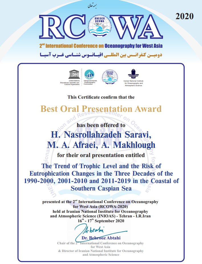 که با همکاری دکتر محمد علی افرایی و مهندس آسیه مخلوق، از محققین و اعضای هیات علمی این پژوهشکده تدوین و تنظیم شده بود به عنوان مقاله برتر دومین کنفرانس بین المللی اقیانوس شناسی غرب آسیا انتخاب گردید