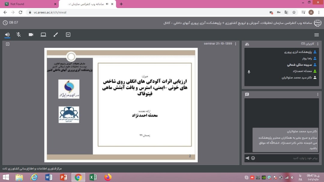 به گزارش روابط عمومی پژوهشکده آبزی پروری آبهای داخلی کشور_ گیلان، سخنرانی علمی تحت عنوان "ارزیابی اثرات آلودگی های انگلی روی شاخص های خونی_ ایمنی، استرس و بافت آبشش ماهی فیتوفاگ" توسط دکتر محدثه احمدنژاد به صورت وبینار در پژوهشکده برگزار گردید. در این تحقیق پیرامون اثرات آلودگی انگلی بر شاخص های خونی و بافت آبشش ماهیان فیتوفاگ پرورشی متعلق به سه مزرعه پرورش ماهیان گرمابی شهرستان رشت مطالبی ارائه گردید. به دلیل گزارش تلفات از مزارع واجد ماهیان آلوده به انگل و مزارعی که ماهی ها فاقد علائم ناشی از حضور انگل بودند و به عنوان سندرم ناشناخته عامل تلفات در نظر گرفته می شدند، تحقیق حاضر انجام شد. حضور انگل داکتیلوژیروس و اسپورهای در موسیستیدیوم در آبشش ماهیان مبتلا به سندرم ناشناخته توسط مطالعه بافت شناسی مشخص گردید. نتایج نشان داد که فاکتورهای خونی، ایمنی و استرس ماهیان فیتوفاگ تحت تاثیر عوامل مختلف زنده و غیر زنده قرار دارند و با بررسی های هیستوپاتولوژیک آبشش نقش انگل ها در ایجاد این ضایعات در ماهیان آلوده به انگل و حتی ماهیان مبتلا به سندرم ناشناخته مشخص تر شد.
