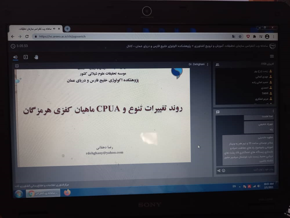 گفتنی است در وبینار تخصصی فوق بیش از 120 شرکت کننده از موسسه تحقیقات علوم شیلاتی کشور و مراکز تابعه در شمال و جنوب، مدیران سازمان شیلات ایران، محققین و اعضای هیات علمی و دانشجویان دانشگاه هرمزگان، اداره کل شیلات و محیط زیست استان، سازمان جهاد کشاورزی استان و جوامع صیادی حضور داشتند.