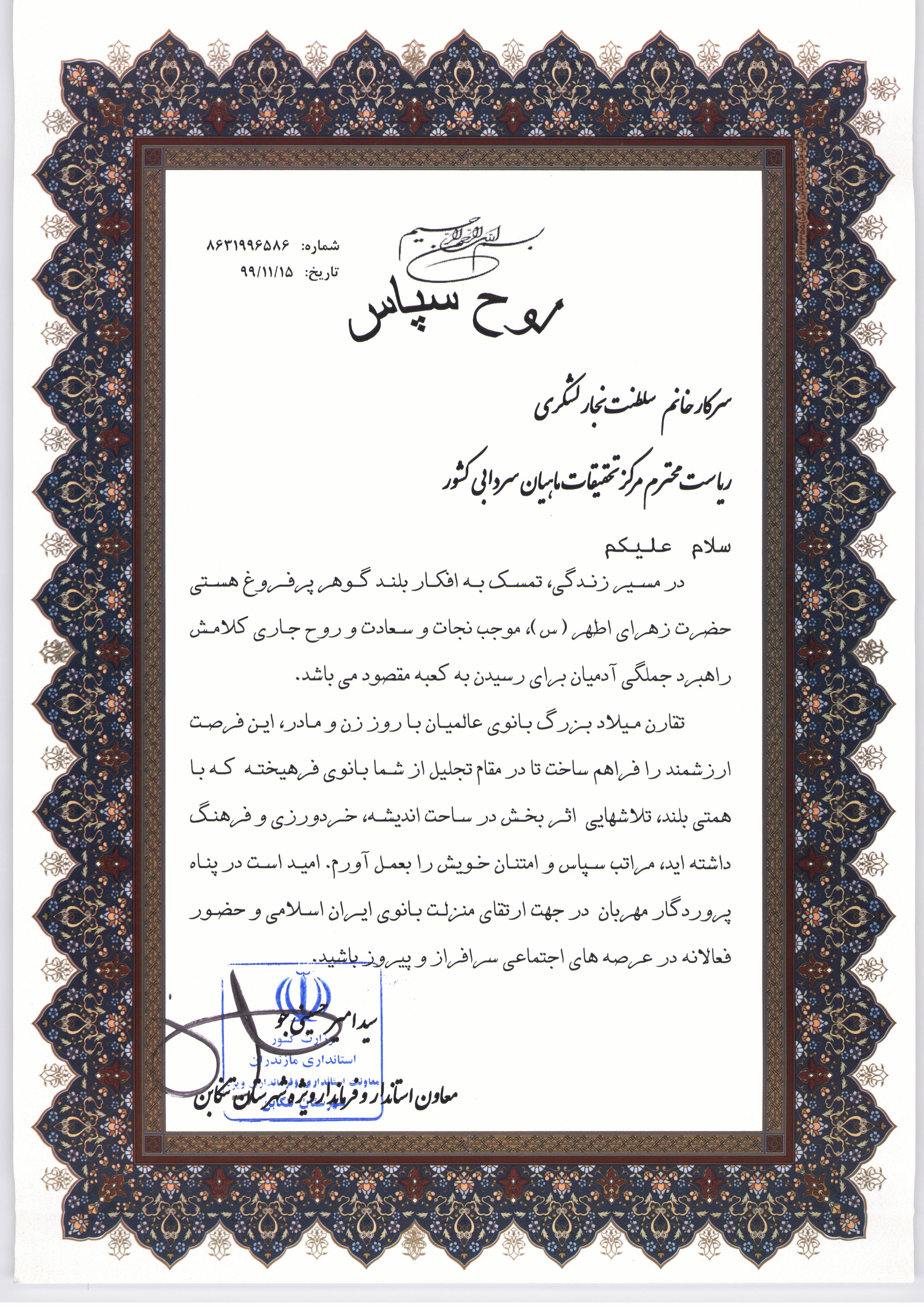 به گزارش روابط عمومی مرکز تحقیقات ماهیان سردآبی کشور_ تنکابن، خانم دکتر لشگری، رئیس این مرکز به دعوت معاون استاندار و فرماندار ویژه شهرستان تنکابن در فرمانداری ویژه این شهرستان حضور یافت و در مراسمی که به مناسبت میلاد حضرت فاطمه (س) برگزار شد با اهداء لوح سپاس از همت بلند و اثر بخشی ایشان در ساحت اندیشه، خردرزی و فرهنگ تشکر و قدردانی شد.