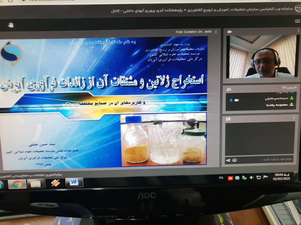 به گزارش روابط عمومی مرکز ملی تحقیقات فرآوری آبزیان، طبق برنامه ریزی و فرخوان انجام شده، در روز دوم برگزاری برنامه ترویجی هفته انتقال یافته های علمی مرکز با عنوان «فرآوری آبزیان با رویکرد انتقال دانش فنی بهره برداری از فرآورده های جانبی آبزیان» ساعت 9 صبح چهارشنبه 15 بهمن 99 دوره تخصصی "استخراج ژلاتین و مشتقات آن از زائدات فرآوری آبزیان و کاربردهای آن در صنایع مختلف" توسط دکتر سید حسن جلیلی با حضور کارشناسان مراکز و پژوهشکده های مختلف زیر مجموعه موسسه تحقیقات علوم شیلاتی کشور، اداره کل شیلات گیلان، مدیریت هماهنگی ترویج جهاد استان گیلان، اداره رسانه های آموزشی کارکنان، کارشناسان موسسه تحقیقات علوم دامی، مروجان پهنه و بهره برداران بخش خصوصی به صورت وبینار برگزار گردید. در این دوره که به نیازمندی های کشور برای تامین مواد اولیه مورد نیاز صنعت تولید ژلاتین کشور، پتانسل های موجود در بخش شیلات، مزایای ژلاتین آبزیان، فرآیندهای تولید، ویژگی های کاربردی این محصول، همچنین مصارف آن در صنایع غذایی، دارویی، پزشکی، آرایشی و بهداشتی پرداخته شد. در پایان، پاسخ های لازم از سوی مدرس دوره به پرسش های حاضران در جلسه ارائه گردید.