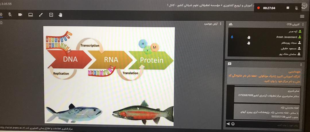 به گزارش روابط عمومی موسسه تحقیقات علوم شیلاتی کشور، کارگاه آموزشی "کاربرد ژنتیک مولکولی در مطالعات آبزیان" در روز دوشنبه مورخ 27 بهمن 1399 از ساعت 9 لغایت15:30 به صورت آنلاین برگزار گردید. کارگاه مذکور توسط بخش زیست فناوری و اعضای هیات علمی موسسه با همکاری مدرسینی از دانشگاه تبریز و دانشگاه نیوفوندلند کانادا (Memorial University of Newfoundland) و حضور علاقمندان این حوزه برگزار و طی آن به موضوعات کاربردی و متنوع در حوزه تحقیقات مولکولی آبزیان پرداخته شد. در این کارگاه دکتر مهدی گلشن (از موسسه تحقیقات علوم شیلاتی کشور) با موضوع "مقدمه ای بر بیوانفورماتیک و معرفی پایگاه داده ها"، دکتر آیه سادات صدر (از پژوهشکده آبزی پروری جنوب کشور) با موضوع "اصول توالی یابی ژنوم، نحوه آنالیز با نرم افزارهای مربوطه و تفسیر نتایج"، دکتر آرش جوانمرد (از دانشگاه تبریز) با موضوع "نگرش اجمالی بر تحقیقات بیان ژن درآبزیان: مبانی، دستاوردهای کاربردی، تفسیرهای خروجی" دکتر سجاد نظری (از مرکز ژنتیک و اصلاح نژاد ماهیان سردآبی) با موضوع "آشنایی با ژن های کاندید در برنامه نوین اصلاح نژاد: اصول و کاربرد در آبزی پروری" و دکتر خلیل اسلاملو (از دانشگاه Memorial University of Newfoundland ) با موضوع "اصول و کاربرد روش ریز آرایه در مطالعات آبزیان" به عنوان مدرس حضور داشتند.