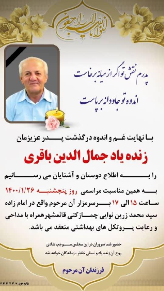 فقدان همکار بزرگوارمان جناب آقای جمال الدین باقری ما را نیز اندوهگین کرد. غفران و رحمت الهی برای آن عزیز از دست رفته و سلامتی و طول عمر با عزت برای خانواده محترم ایشان را از پروردگار متعال خواهانیم.