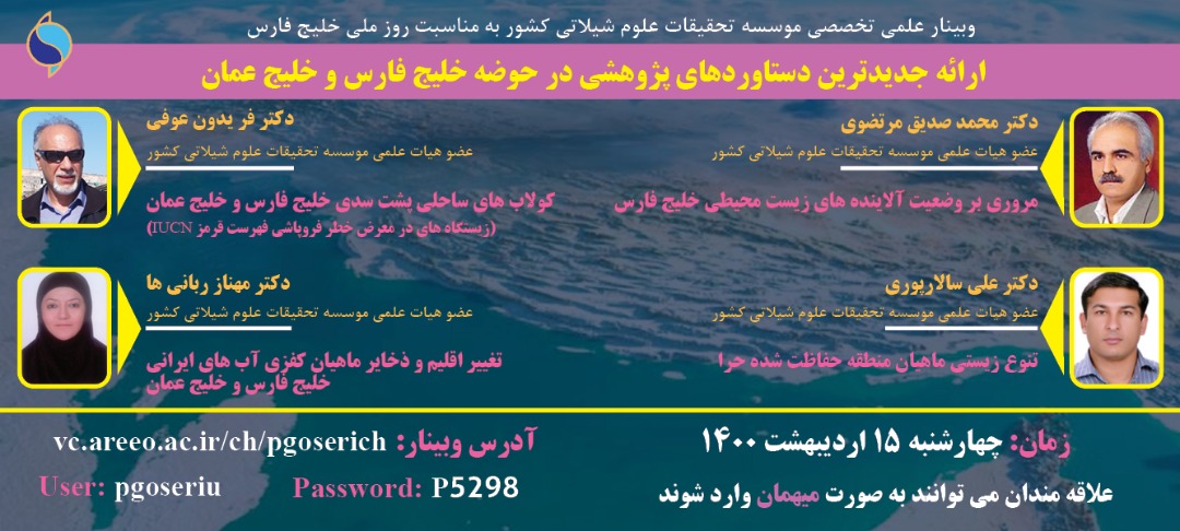 به گزارش روابط عمومی پژوهشکده اکولوژی خلیج فارس و دریای عمان – بندرعباس، به مناسبت پایداشت روز ملی خلیج فارس، در روز چهارشنبه مورخ 15 اردیبهشت 1400، این پژوهشکده با همکاری موسسه تحقیقات علوم شیلاتی کشور، وبینار علمی تخصصی با عنوان "ارائه جدیدترین دستاوردهای پژوهشی در حوضه خلیج فارس و دریای عمان" برگزار نمود. سخنرانان این وبینار دکتر مهناز ربانیها و دکتر فریدون عوفی از موسسه تحقیقات علوم شیلاتی کشور بودند که به ترتیب در خصوص "تغییر اقلیم و ماهیان کفزی آبهای ایرانی خلیج فارس و خلیج عمان" و "کولاب های ساحلی پشت سدی خلیج فارس و دریای عمان" و دیگر سخنرانان وبینار، دکتر محمدصدیق مرتضوی و دکتر علی سالارپوری از پژوهشکده اکولوژی خلیج فارس و دریای عمان در خصوص "آخرین وضعیت آلاینده های زیست محیطی خلیج فارس" و "تنوع زیستی منطقه حفاظت شده حرا" به ارائه آخرین دستاوردهای حاصل از اجرای پروژه های پژوهشی پرداختند. در این وبینار، دانشجویان، اساتید دانشگاهی و محققین مراکز پژوهشی حضور یافتند.
