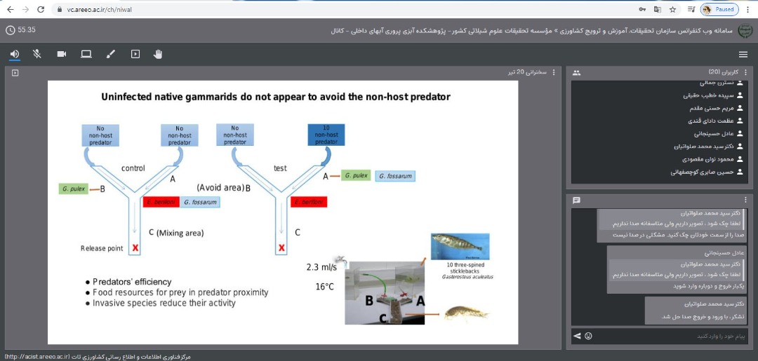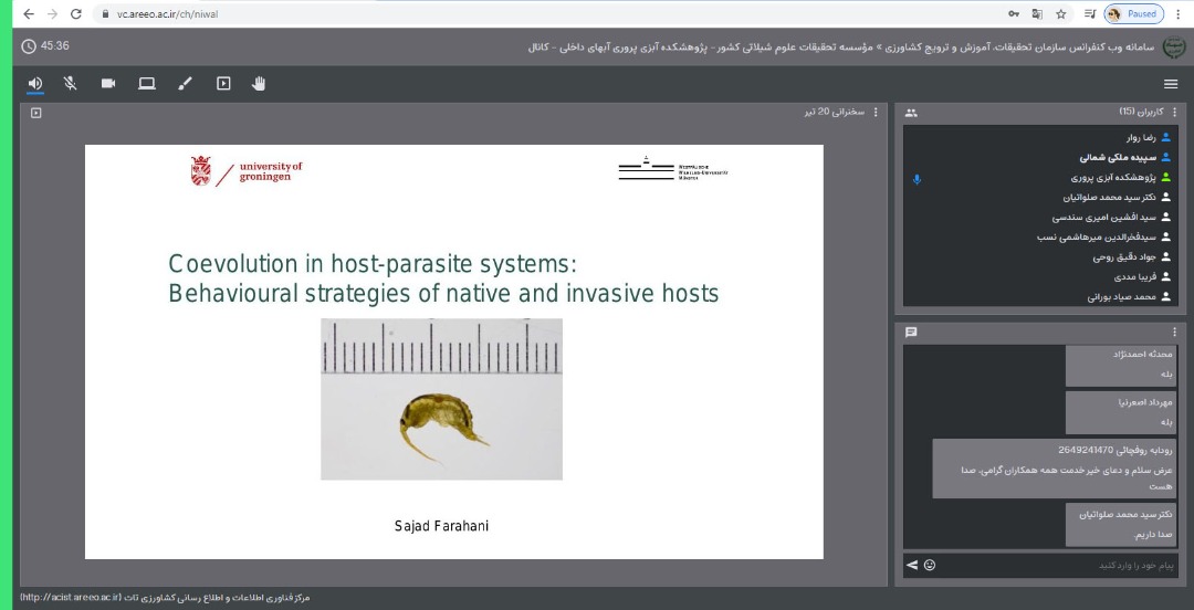 به گزارش روابط عمومی پژوهشکده آبزی پروری آبهای داخلی کشور_ گیلان، سخنرانی علمی با عنوان " تکامل همزمان انگل و میزبان، استرتژی های رفتاری بین گونه های میزبان آمفی پودا و مهاجم" توسط دکتر سجاد فراهانی به صورت وبینار روز یکشنبه مورخ 20 تیر 1400 در پژوهشکده برگزار گردید. در اين وبينار به تشريح تغيير رفتار ميزبان واسط (بومى و مهاجم) به وسيله انگل جهت بقا در شرايط استرس زا محيطى (نظير شكارچى غير ميزبان، افزايش شورى و شدت جريان آب) و با هدف رسيدن به ميزبان نهايي، پرداخته شد. نتايج اين تحقيق كه در دو كشور آلمان و هلند صورت پذيرفته می تواند در حفاظت آبشخورهاى پرندگان آبزی و جا نمايی درست مزارع پرورش پرندگان آبزى و حتى پرورش توام ماهى و پرنده آبزی می تواند كاربرد داشته باشد، همچنين با استفاده از رفتارهاى ناجور پايان (آمفی پوداها) به عنوان غذاى زنده در توسعه صنعت آبزی پرورى قدم هاى موثرى برداشت.
