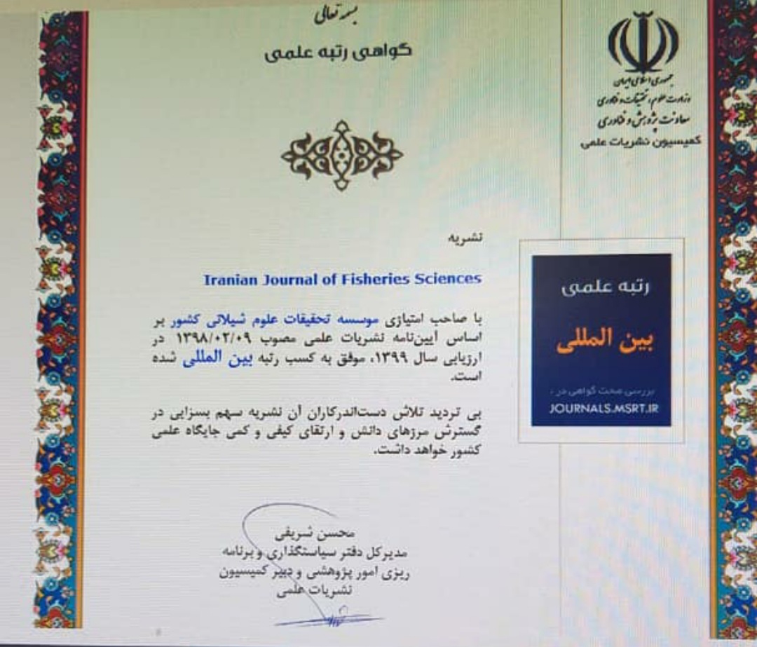 به گزارش روابط عمومی موسسه تحقیقات علوم شیلاتی کشور، رتبه علمی نشریه Iranian Journal of Fisheries Sciences در ارزیابی سال ۱۳۹۹ وزارت علوم تحقیقات و فناوری، بین المللی شد. در این گواهی آمده است: با صاحب امتیازی موسسه تحقیقات علوم شیلاتی کشور بر اساس آیین نامه نشریات علمی مصوب 1398/2/9 ، در ارزیابی سال 1399، نشریه Iranian Journal of Fisheries Sciences موفق به کسب رتبه بین المللی شده است.