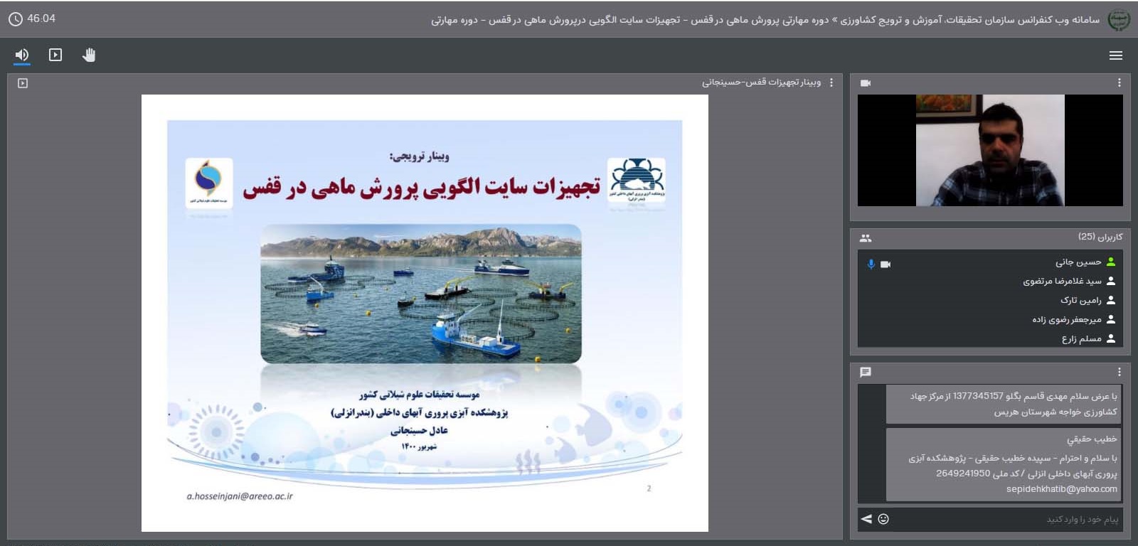 به گزارش روابط عمومی پژوهشکده آبزی پروری آبهای داخلی بندرانزلی، روز یکشنبه ۷شهریور ماه ۱۴۰۰ وبینار ترویجی (دوره مهارتی) با عنوان "تجهیزات سایت الگویی پرورش ماهی در قفس" توسط محقق این پژوهشکده، مهندس عادل حسینجانی در سامانه وب کنفرانس سازمان تحقیقات، آموزش و ترویج کشاورزی برگزار گردید. سخنران وبینار ضمن اشاره به این موضوع که امروزه صنعت آبزی پروری به ویژه در دریا از طیف وسیعی از فناوری ها بهره می برد، به استفاده از مهندسی آبزیان و روش های علمی برای ارائه غذای سالم به مصرف کننده نهایی به ویژه در آبزی پروری توصیه کرد. وی در ادامه، به معرفی ادوات و تجهیزات لازم در سایت های الگویی پرورش ماهی در قفس پرداخت. مهندس حسینجانی، ضمن ذکر کمبودها و نیازهای پرورش ماهی در قفس در دریای خزر و لزوم توجه به رفع نقایص موجود به منظور توسعه پایدار و اقتصادی به پاره ای از اقدامات ضروری با توجه به توانمندی های موجود و علیرغم کمبودها، پیش از سرمایه گذاری و در طول دوره پرورش ماهی در قفس اشاره نمود. وبینار مذکور در پایان با پرسش و پاسخ شرکت کنندگان و مدرس دوره خاتمه یافت.