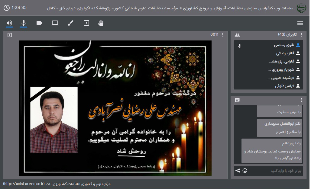 به گزارش روابط عمومی پژوهشکده اکولوژی دریای خزر، از آنجا که درگذشت مهندس علی رضائی چنان سنگین و جانسوزاست که به دشواری به باور می نشیند، ولی در برابر تقدیر چاره ای جز رضا نیست. لذا به یاد آن عزیز ازدست رفته، مراسم ختم مجازی به صورت وبیناری، روز سه شنبه 16 شهریور، ساعت 9.40 صبح با حضور همکاران پژوهشکده و ایستگاه خیرود و سایر همکاران موسسه و مراکز با ذکر تلاوتی چند از کلام ا.. مجید توسط آقایان محمودی و شیخ اسفندیاری آغاز گردید.