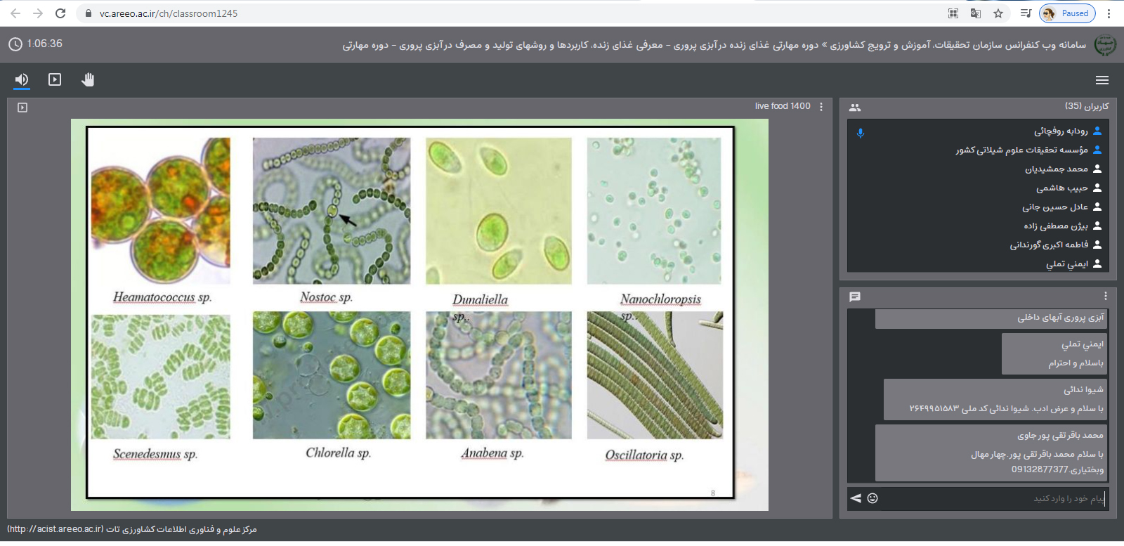 به گزارش روابط عمومي پژوهشكده آبزي پروري آبهاي داخلي كشور، مورخ ٢ آبان ١٤٠٠ وبينار ترويجي با عنوان "مقدماتی بر معرفی غذای زنده، کاربردها و روش های تولید و مصرف در آبزی پروری" توسط دكتر رودابه روفچايي از محققين پژوهشكده آبزي پروري آبهاي داخلي در سامانه وب کنفرانس سازمان تحقیقات، آموزش و ترویج کشاورزی برگزار گردید. در این دوره آموزشی ضمن معرفی مروری گونه هاي متداول غذای زنده بر اساس سیستماتیک علمی، ضرورت استفاده از غذای زنده در صنعت آبزی پروری شرح داده شد. پرورش غذاهای زنده ای چون ایتفوزوئرها، فلاگ و مگس میوه با امکانات ساده موجود در آزمایشگاه با کلیپ های مربوطه بیان گردید. در این دوره آموزشی ضرورت استفاده ار ترکیب غذاهای زنده با استناد تحقیقات جدید ارایه شد. در این راستا به استفاده از ترکیب گونه های غذای زنده ای چون کوپی پودا، روتیفرها و آرتمیا در پرورش لاروهای دریائی اشاره شد و در انتها به پرسش های شرکت کنندگان پاسخ داده شد.