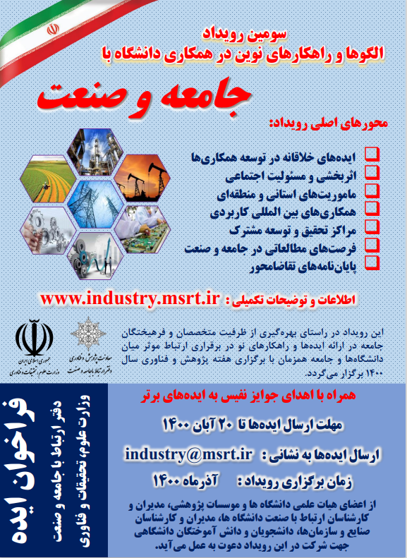 به گزارش روابط عمومی پژوهشکده میگوی کشور، معاونت پژوهش و فناوری وزارت علوم، تحقیقات و فناوری در راستای اجرای سیاستها و اقدامات به منظور توسعه ارتباط دانشگاهها با جامعه و صنعت اقدام به برگزاری سومین رویداد با عنوان "رویداد الگوها و راهکارهای نوین در همکاری دانشگاه با جامعه و صنعت" همزمان با هفته پژوهش نموده است. دفتر ارتباط با جامعه و صنعت وزارت علوم، تحقیقات و فناوری قصد دارد در راستای تقویت ارتباط دانشگاه ها با بخش های مختلف جامعه و صنعت و در راستای بهره گیری از ظرفیت فرهیختگان جامعه در ارائه ایدهها و راهکارهای نو در برقراری ارتباط موثر میان دانشگاه و جامعه، همزمان با برگزاری هفته پژوهش و فناوری سال 1400 اقدام به برگزاری رویداد ایدههای برتر با موضوع ارتباط دانشگاه با جامعه و صنعت نماید. این رویداد با هدف شناسایی و تقدیر از ایدهها و الگوهای نوین در توسعه و تسهیل ارتباط دانشگاه ها، پژوهشگاه ها و موسسات آموزشی، پژوهشی و فناوری با جامعه و صنعت برگزار می گردد. ایدههای نوین و برگزیده در این رویداد می تواند در بهبود همکاریهای بین مراکز علمی و اجرایی موثر واقع شده و بنا به فراخور امکانات و زیرساختهای موجود، در دستور کار جهت اجرایی شدن قرار گیرد.