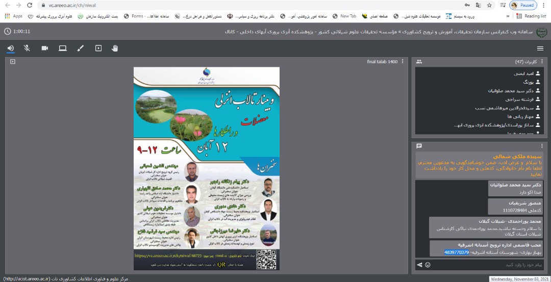 به گزارش روابط عمومی پژوهشکده آبزی پروری آبهای داخلی کشور_ گیلان، وبینار تخصصی "تالاب انزلی، معضلات و راهکارها" در پژوهشکده برگزار گردید. ابتدا دکتر میرزاجانی، عضو هیئت علمی پژوهشکده و دبیر همایش ضمن خوش آمدگویی برنامه وبینار را ارائه دادند. سپس دکتر صیاد بورانی، رئیس پژوهشکده بیاناتی کوتاه در مورد اهمیت تالاب انزلی و نقش پژوهشکده در انجام پروژه های تحقیقاتی_ اجرایی در تالاب انزلی طی ادوار گذشته را ایراد کردند. در وبینار مذکور ۷ سخنرانی روی موضوعات اساسی تالاب انزلی ارائه گردید. در انتها برخی از سوالات مطرح شده در وبینار توسط رئیس اداره محیط زیست انزلی پاسخ داده شد و تعدادی از شرکت کنندگان نیز اظهار نظر سازمانی خود را بیان داشتند. پیشنهادات ارائه شده توسط سخنرانان، در چند بند، جمع بندی گردید تا به عنوان مصوبات وبینار به استانداری گیلان و کمیته احیای تالاب، همچنین اداره کل حفاظت محیط زیست تقدیم گردد.