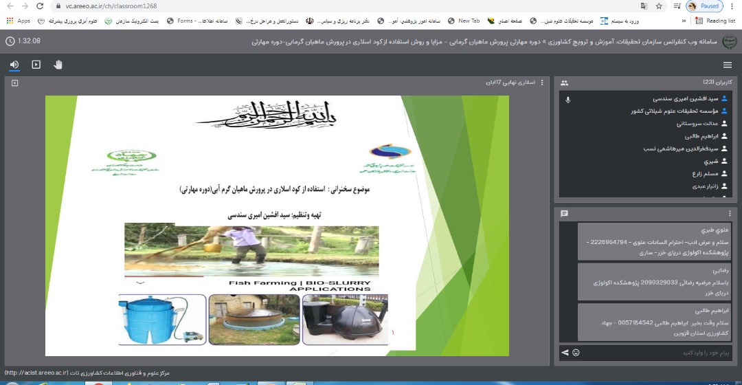 به گزارش روابط عمومی پژوهشكده آبزی پروری آبهای داخلی كشور_ گیلان، وبينار ترويجي با عنوان "مزایا و روش استفاده از کود اسلاری در پرورش ماهیان گرمابی" توسط مهندس افشین امیری سندسی از محققين پژوهشكده در سامانه وب کنفرانس سازمان تحقیقات، آموزش و ترویج کشاورزی برگزار گردید. در این وبینار ترویجی سیستم ساخت اسلاری، مزایای این روش، ضریب بازماندگی بالای بچه ماهیان، استفاده نکردن از کود شیمیایی که نقش مهمی در حفاظت محیط زیست و تولید پایدار دارد مورد بحث و بررسی قرار گرفت. در ادامه، تولید گاز متان به عنوان یک محصول جانبی که نقش مهمی در تولید انرژی در کشورهای هند و بنگلادش دارد نیز گفتگو شد.