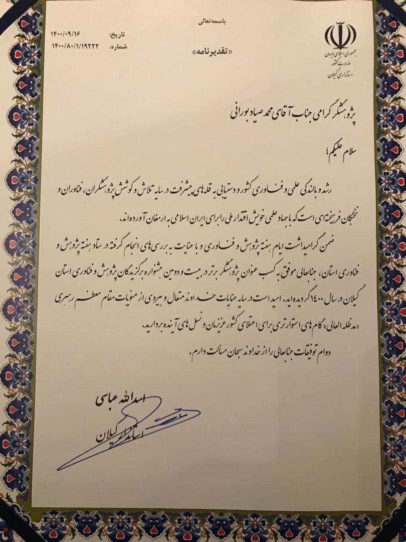 به گزارش روابط عمومی پژوهشکده آبزی پروری آبهای داخلی کشور_ گیلان، مراسم اختتامیه جشنواره هفته پژوهش استان با تجلیل از پژوهشگران و فناوران برتر گیلان عصر چهارشنبه 17 آذرماه 1400 در استانداری گیلان برگزار شد. در این مراسم دکتر محمد صیاد بورانی، رئیس پژوهشکده موفق به کسب عنوان پژوهشگر برتر در بیست و دومین جشنواره برگزیدگان پژوهش و فناوری استان گیلان در سال 1400گردیدند.