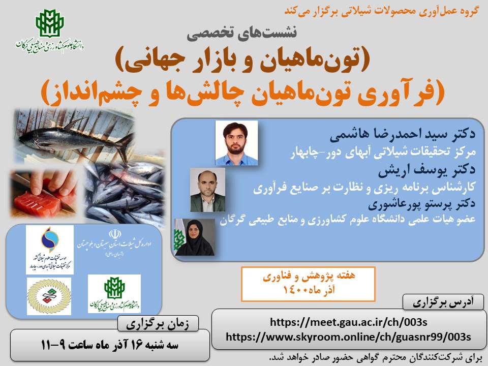 به گزارش روابط عمومی مرکز تحقیقات شیلاتی آبهای دور_ چابهار، وبینار آموزشی تحت عنوان "بررسی صید تون ماهیان در ایران و جهان، فرآوری تون ماهیان، چشم انداز و چالش ها" با همکاری دانشگاه کشاورزی و منابع طبیعی گرگان (در قالب تفاهم نامه همکاری) و اداره کل شیلات استان سیستان و بلوچستان برگزار شد. ابتدا خانم دکتر پور عاشوری از گروه شیلات (فرآوری آبزیان) دانشگاه گرگان، در خصوص اهمیت تون ماهیان و نقش فرآوری در ارتقاء ارزش افروده محصولات شیلاتی توضیحاتی دادند. سپس دکتر سید احمدرضا هاشمی (عضو هیئت علمی مرکز تحیقات شیلاتی آب های دور) به بررسی میزان صید و تجارت تون ماهیان در ایران و جهان پرداخته و به بازارهای بزرگ تون ماهیان در جهان اشاره نموده و بر اهمیت نقش تون ماهیان در ارز آوری، برای کشور تاکید داشت. در ادامه دکتر یوسف اریش از اداره کل شیلات استان سیستان و بلوچستان به تاریخچه کنسرو سازی پرداخته و از اهمیت فرآوری تون ماهیان در راستای گسترش بهره برداری پایدار مطالبی را عنوان نمود. در پایان مهندس حمیدرضا مرادی (فعال بخش خصوصی) از تجربه و فعالیت این بخش تأثیر گذار در کشور سخن گفت و سخنرانان به سؤالات شرکت کنندگان پاسخ دادند.