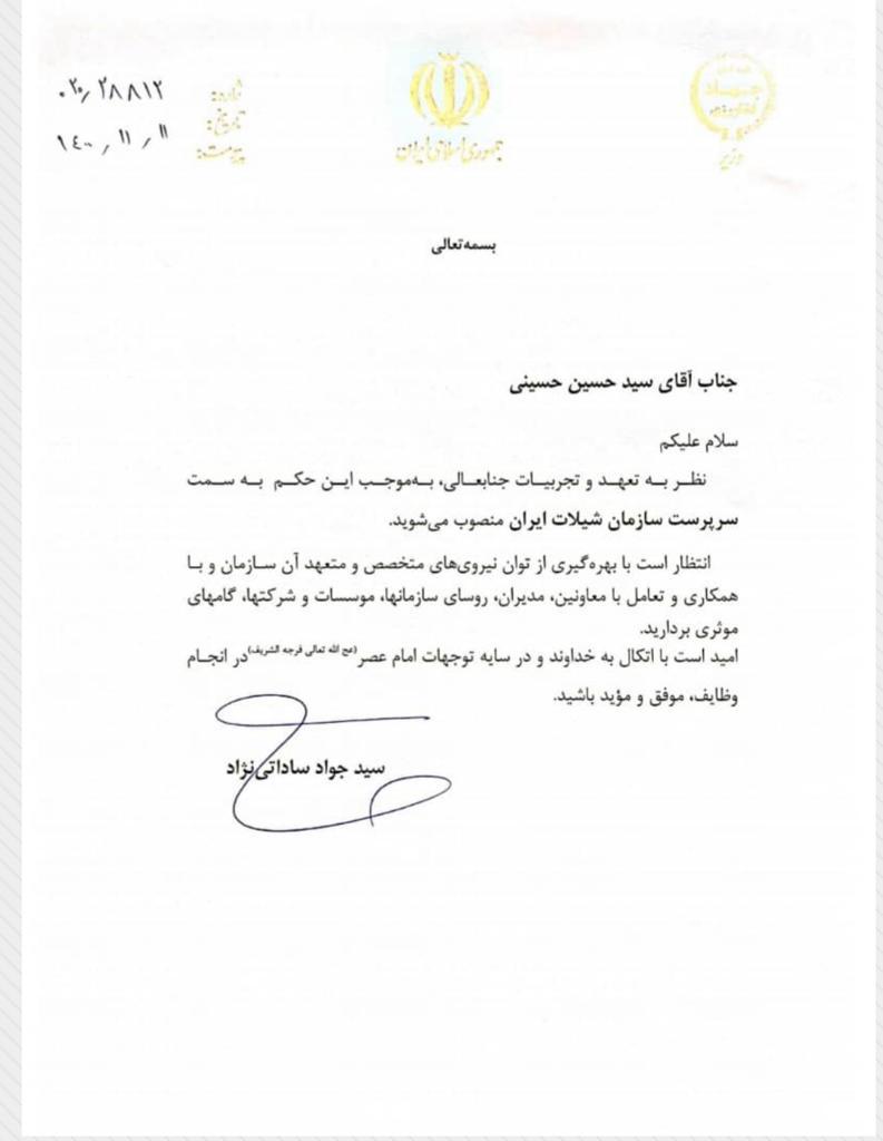 نظر به تعهد و تجربیات جنابعالی، به موجب این حکم به سمت سرپرست سازمان شیلات ایران منصوب می شوید. انتظار است با بهره گیری از توان نیروهای متخصص و متعهد آن سازمان و با همکاری و تعامل با معاونین، مدیران، روسای سازمانها، موسسات و شرکتها، گام های موثری بردارید.