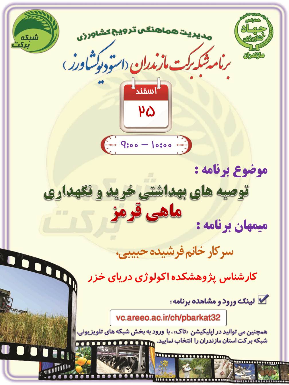 به گزارش روابط عمومی پژوهشکده اکولوژی دریای خزر_ ساری، خانم مهندس فرشیده حبیبی، کارشناس ارشد بخش بهداشت و بیماری های آبزیان، در برنامه شبکه برکت مازندران (استودیو کشاورز) حضور یافت. با فرا رسیدن عید نوروز، علاقمندی مردم برای خرید آبزیان زینتی بویژه ماهی قرمز افزایش می یابد که در این ارتباط، رعایت اصول ساده بهداشتی می تواند نقش مهمی در پیشگیری از بروز بیماری های مشترک بین انسان و ماهی و سلامت خانواده داشته باشد هرچند که تاکنون در کشور گزارش مستندی از بروز بیماری های خطرناک منتقل شده از ماهیان زینتی، منتشر نشده است. وی میهمان این برنامه با موضوع "توصیه های بهداشتی خرید و نگهداری ماهی قرمز" بودکه توضیحاتی را در خصوص انتخاب ماهی قرمز سالم و خرید آن از مراکز مجاز و بهداشتی، نگهداری درست ماهی، تغدیه و ضدعفونی کردن آن، عدم رهاسازی ماهیان قرمز در منابع آبی طبیعی و خودداری از خرید سایر جانوران وحشی و غیربومی مثل لاک پشت گوش قرمز یا حلزون سیبی را بیان کرد.