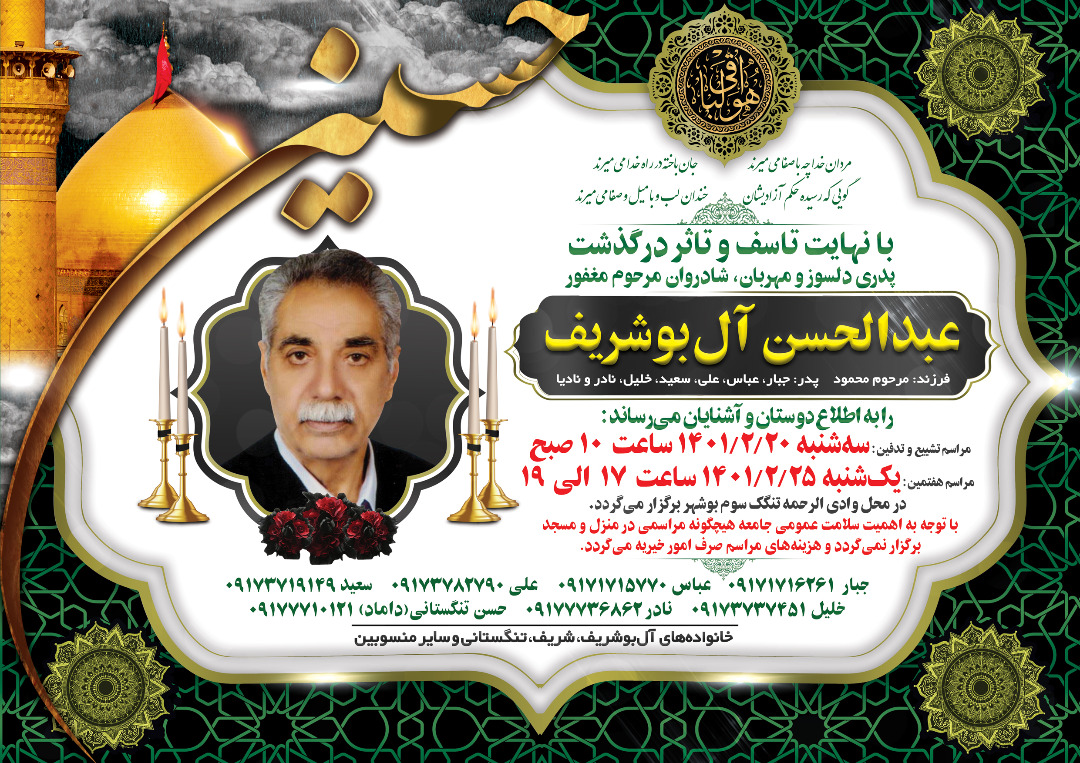 در کمال تأسف باخبر شدیم همکار بازنشسته عزیزمان در پژوهشکده میگوی کشور_ بوشهر، جناب آقای مهندس عبدالحسن آل بوشریف، دار فانی را وداع گفت. این ضایعه بزرگ را بـه خانواده ارجمند ایشان و جامعه شیلاتی و همکاران محترم موسسه تحقیقات علوم شیلاتی کشور تسلیت عرض نموده و از خداوند متعال برای ایشان طلب مغفرت و برای خانواده محترمشان صبر جمیل مسئلت می نمایم.