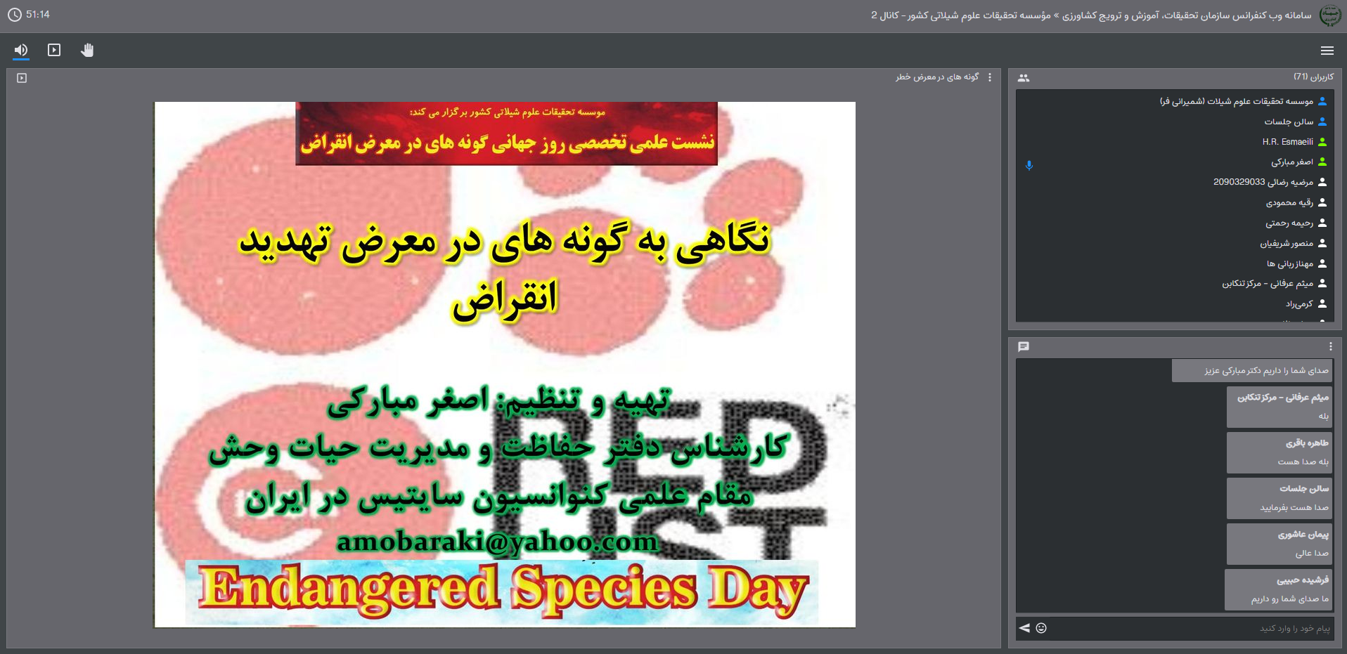 سپس دکتر اصغر مبارکی از سازمان حفاطت محیط زیست کشور، با تعریف عبارت گونه های در معرض خطر، گفت: در خطر انقراض، یعنی یک گونه در تمام یا بخش قابل توجهی از محدوده خود در خطر انقراض است، اما در معرض تهدید، به این معنی است که یک گونه احتمالاً در آینده قابل پیش بینی در معرض خطر انقراض قرار می گیرد.