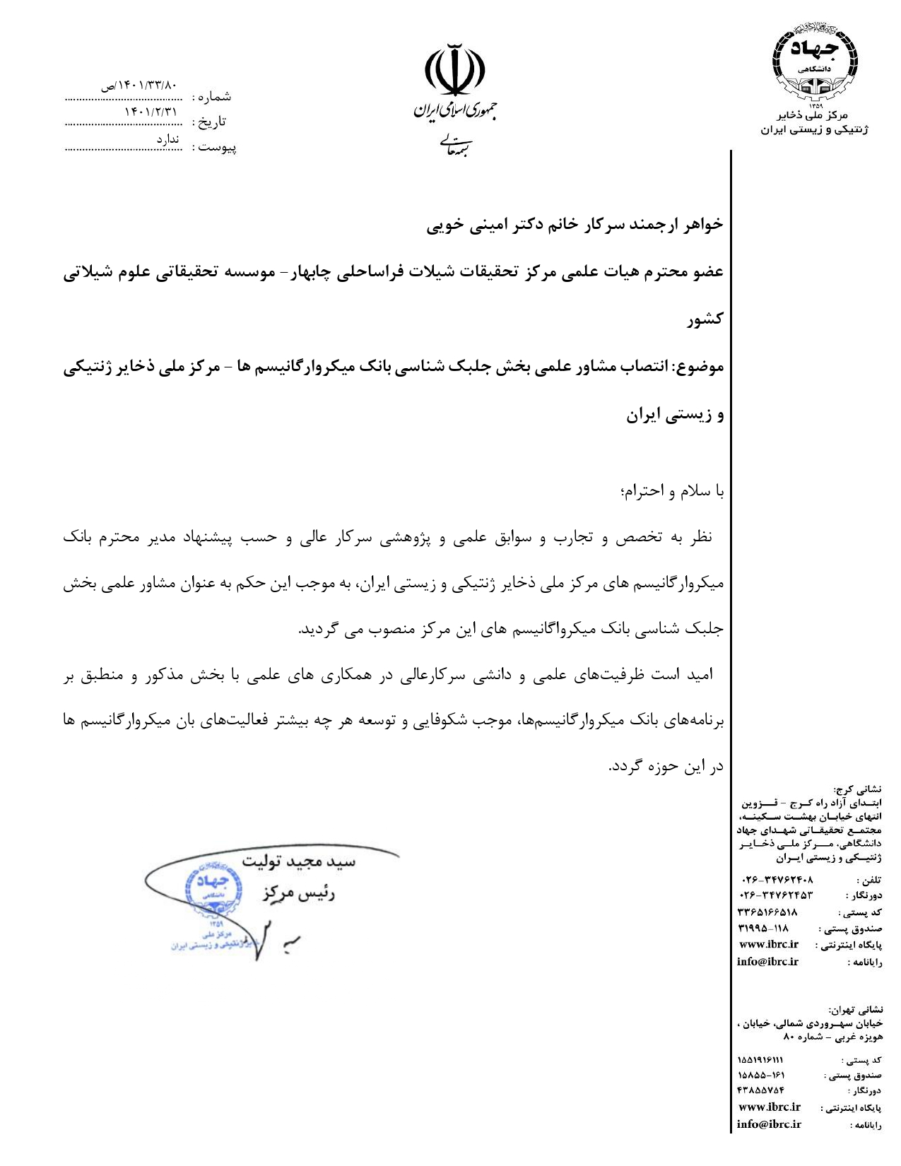 نظر به تخصص، تجارب، و سوابق علمی و پژوهشی سرکار عالی حسب پیشنهاد مدیر بانک میکروارگانیسم های مرکز ذخایر ژنتیکی و زیستی ایران به موجب این حکم به عنوان مشاور علمی بخش جلبک شناسی بانک میکروارگانیسم های این مرکز منصوب می گردید.