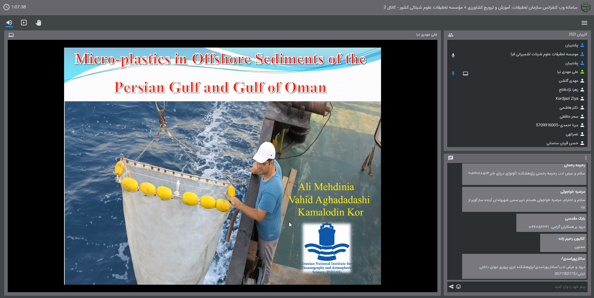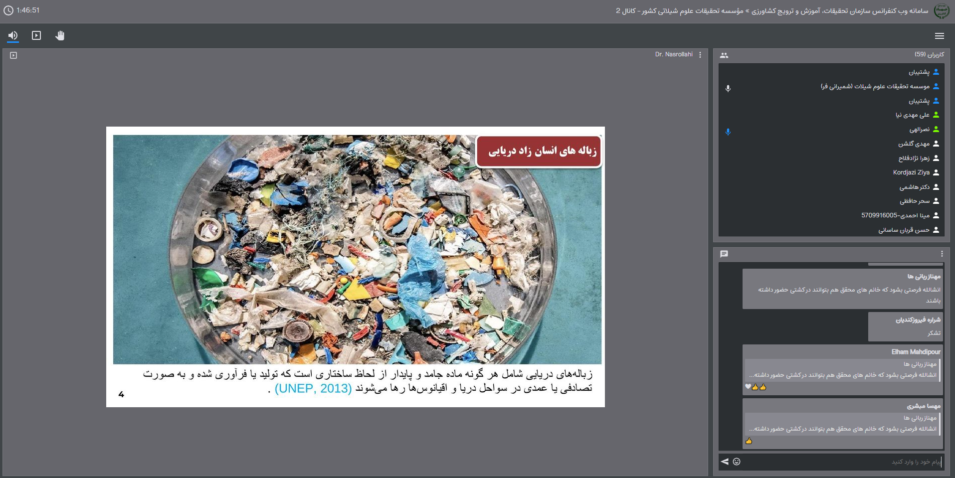 ماهیت و منشا زباله های شناور، زباله های شناور به عنوان حامل های پراکنش موجودات، ترکیب جوامع رفتینگ روی زباله های شناور و ترکیب گونه های رفتینگ ها، از مهمترین مواردی بود که دکتر نصرالهی آنها را تشریح کرد.