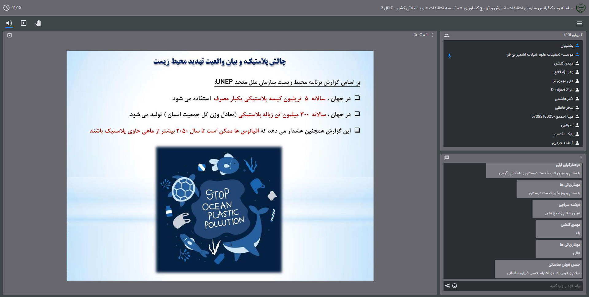 به گزارش روابط عمومی موسسه تحقیقات علوم شیلاتی کشور، دکتر فریدون عوفی، در آغاز این نشست، سخنرانی خود با عنوان نگاهی به روز جهانی پلاستیک (کانون های انباشت پلاستیک در سواحل ایران، تهدید یا فرصت) را ارائه کرد. وی، با اشاره به گزارش برنامه محیط زیست سازمان ملل متحد، گفت: در جهان سالانه 5 تریلیون کیسه پلاستیکی یکبار مصرف استفاده می شود که این موضوع ممکن است باعث شود تا سال 2050 اقیانوس ها بیشتر از ماهی، حاوی پلاستیک باشند.