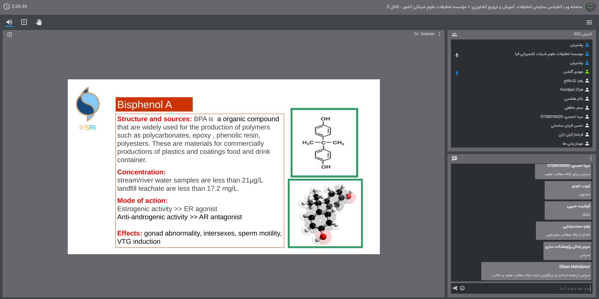 در ادامه، دکتر مهدی گلشن، از بخش زیست فناوری موسسه تحقیقات علوم شیلاتی کشور، در ارتباط با بیسفنول اِی (BPA) و بیومارکرهای هشداردهنده، مطالبی را ارائه کرد.