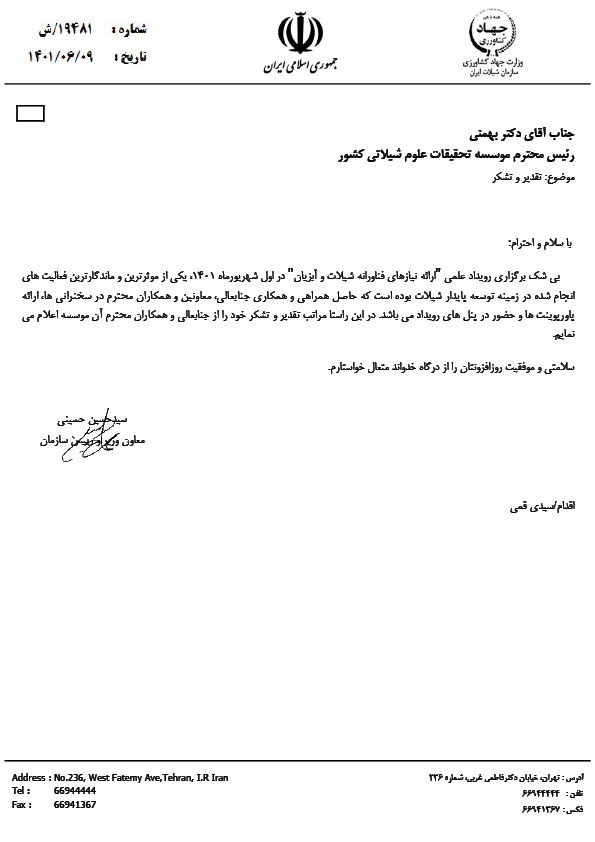 به گزارش روابط عمومی موسسه تحقیقات علوم شیلاتی کشور، در این تقدیر نامه آمده است: بیشک برگزاری رویداد علمی «ارائه نیازهای فناورانه شیلات و آبزیان» در اول شهریور ماه ۱۴۰۱ یکی از